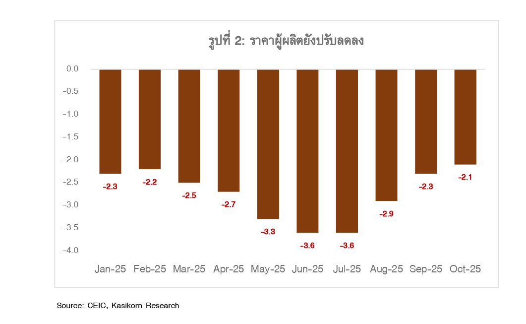 ในเดือนต.ค.68 เงินเฟ้อผู้ผลิตจีน (PPI) ชะลอการหดตัวติดต่อกันเป็นเดือนที่ 4 อยู่ที่ -2.1%YoY จาก -2.3%YoY ในเดือนก.ย.68 (รูปที่ 2) สะท้อนว่ามาตรการ Anti-Involution ของทางการจีนได้เข้ามาช่วยหนุนระดับราคาผู้ผลิตได้ในบางอุตสาหกรรม เช่น โลหะกลุ่มเหล็ก (Ferrous Metal) ถ่านหิน รวมถึงอุตสาหกรรมรถยนต์