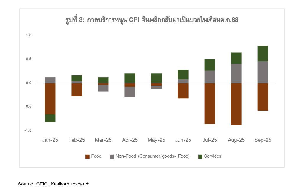 ขณะที่เงินเฟ้อผู้บริโภคจีนเดือนต.ค.68 พลิกกลับมาเป็นบวกอยู่ที่ 0.2%YoY จาก -0.3%YoY ในเดือนก.ย.68 ได้รับปัจจัยหนุนจากภาคบริการ เนื่องจากช่วงต้นเดือนต.ค.68 มีวันหยุดยาวช่วงวันชาติจีน ขณะที่ราคาอาหารชะลอการหดตัวแต่ยังเป็นปัจจัยกดดันเงินเฟ้อจีน (รูปที่ 3) ด้านเงินเฟ้อพื้นฐานปรับตัวดีขึ้นอยู่ที่ 1.2%YoY จาก 1.0%YoY