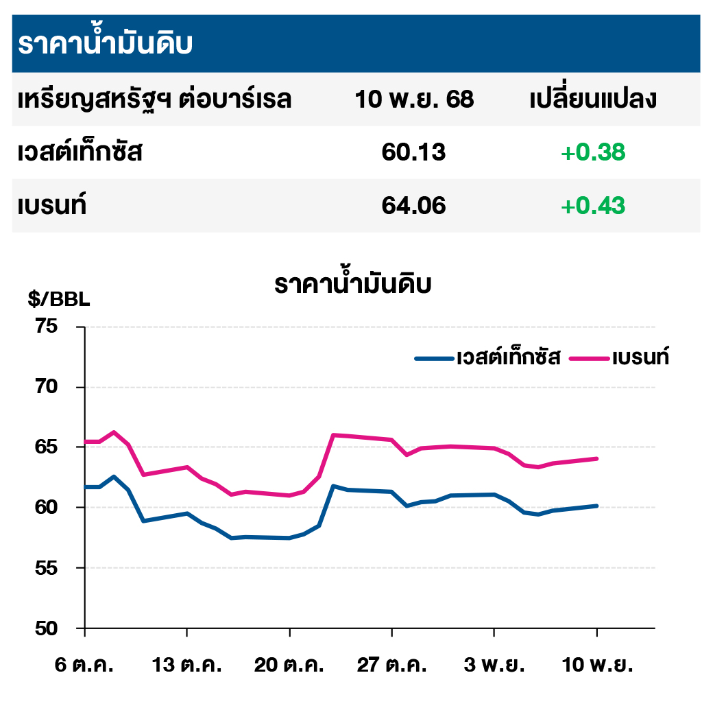 (+) ราคาน้ำมันดิบเวสต์เท็กซัสและเบรนท์ปรับเพิ่มขึ้น หลังสหรัฐฯ สามารถที่จะยุติภาวะปิดหน่วยงานรัฐบาล (Shutdown) ซึ่งดำเนินมากว่า 41 วัน ได้ชั่วคราวจนถึงวันที่ 30 ม.ค. 69 ภายหลังวุฒิสภาได้ลงคะแนนด้วยมติ 60-40 ผ่านการสนับสนุนของพรรคเดโมแครตสายกลางเพื่อยุติการซัดดาวน์ โดยในขั้นถัดไปจะเป็นการเสนอร่างกฎหมายดังกล่าวต่อสภาผู้แทนราษฎรเพื่อขออนุมัติในวันพุธนี้