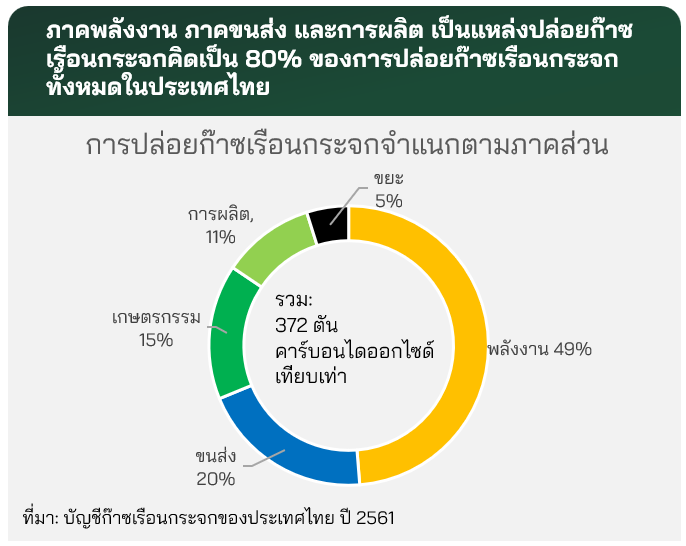 ภาคพลังงาน ภาคขนส่ง และภาคการผลิต เป็นแหล่งปล่อยก๊าซเรือนกระจกหลักของประเทศไทย คิดเป็นสัดส่วนถึง 70 - 80% ของการปล่อยก๊าซเรือนกระจกทั้งหมด 1 และเป็นภาคส่วนที่มีความเสี่ยงสูงต่อการเกิดสินทรัพย์สูญค่าในอนาคตด้วย
