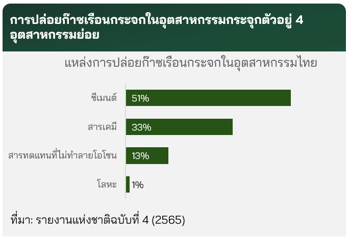 ปล่อยก๊าซเรือนกระจกของภาคการผลิตส่วนใหญ่กระจุกตัวอยู่ในอุตสาหกรรมผลิตปูนซีเมนต์ เคมีภัณฑ์ และสารทดแทนที่ไม่ทำลายโอโซน