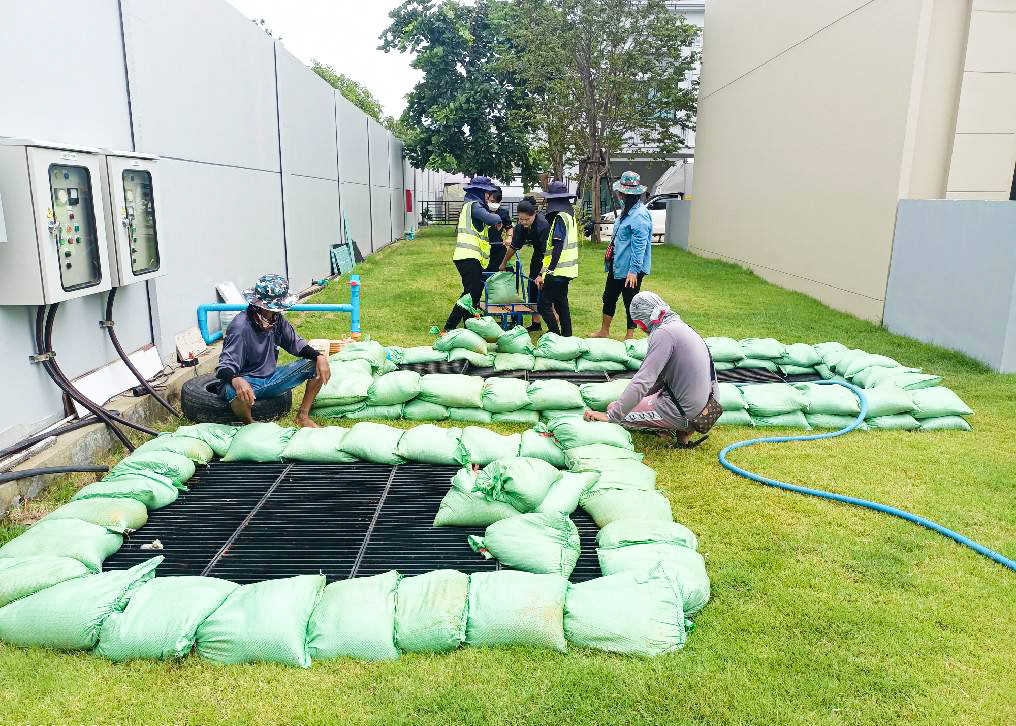 ในทุกโครงการ พลัสฯ มีการจัดการพื้นที่รับน้ำและระบบระบายน้ำ โดยการกำจัดเศษขยะ สิ่งกีดขวาง ลอกท่อระบายน้ำเป็นประจำ และเมื่อมีแนวโน้มเกิดน้ำท่วมจะมีการถ่ายน้ำออกจากท่อระบายน้ำ เพื่อเพิ่มประสิทธิภาพการรองรับน้ำ พร้อมทั้งตรวจสอบอุปกรณ์และเครื่องมือ ทดสอบระบบปั๊มน้ำ ตรวจสอบการทำงานของบ่อพักน้ำ ท่อ และประตูระบายน้ำให้พร้อมใช้งาน ทั้งนี้ สำหรับบางโครงการที่เสี่ยงน้ำท่วม เรามีการจัดเตรียมปั๊มพญานาคและปั๊มแบบ Mobile เพื่อใช้ในการระบายน้ำออก รวมถึงกระสอบทรายในการกั้นน้ำ เพื่อรับมือหากเกิดน้ำท่วมในโครงการ