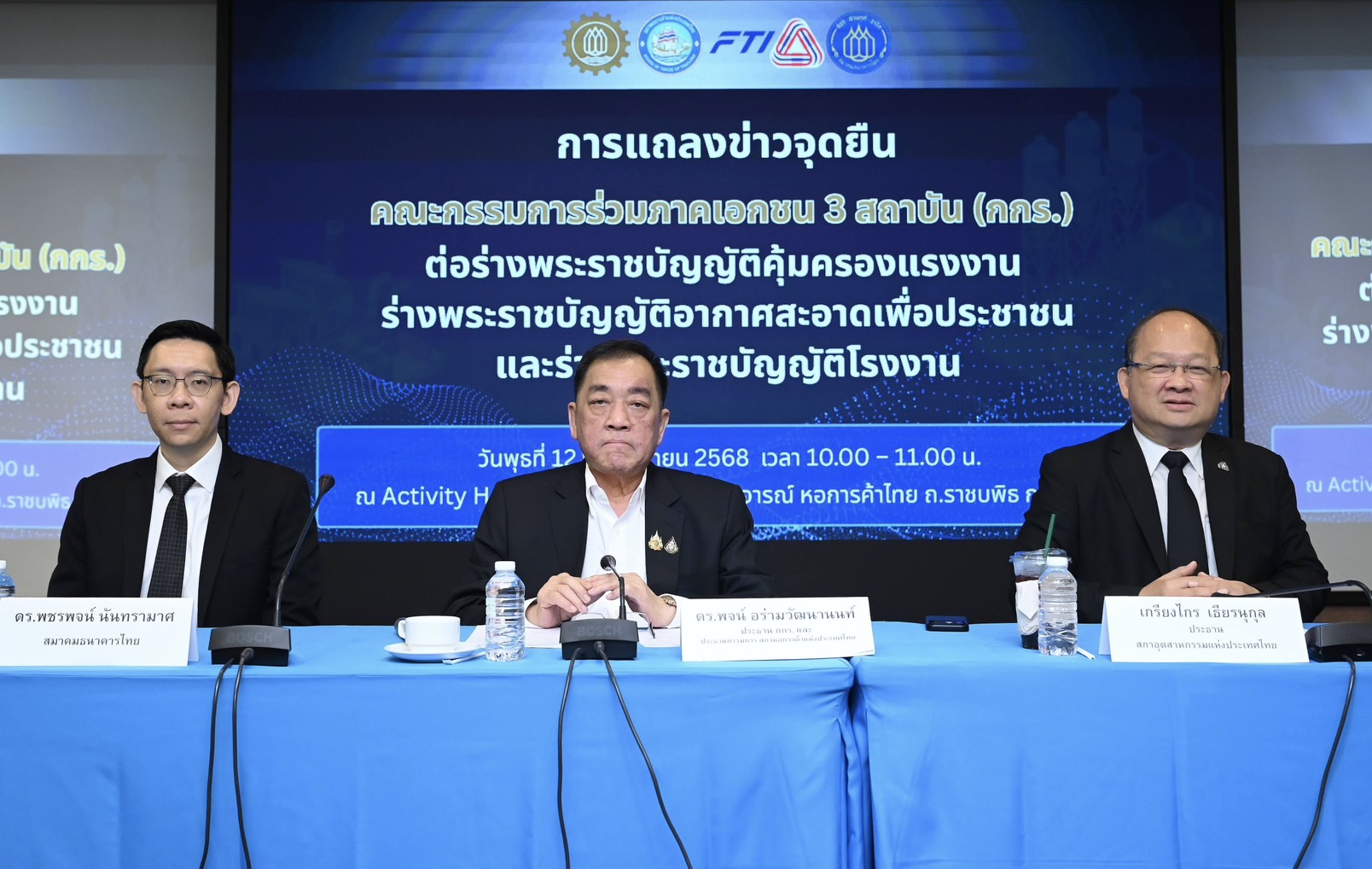 คณะกรรมการร่วมภาคเอกชน 3 สถาบัน (กกร.) ประกอบด้วยสภาหอการค้าแห่งประเทศไทย สภาอุตสาหกรรมแห่งประเทศไทย และสมาคมธนาคารไทย แถลงจุดยืนต่อร่างกฎหมายสำคัญ 3 ฉบับ ได้แก่ 1) ร่างพระราชบัญญัติคุ้มครองแรงงาน (ฉบับที่ ..) พ.ศ. … 2) ร่างพระราชบัญญัติบริหารจัดการเพื่ออากาศสะอาด พ.ศ. … และ 3) ร่างพระราชบัญญัติโรงงาน (ฉบับที่ ..) พ.ศ. …