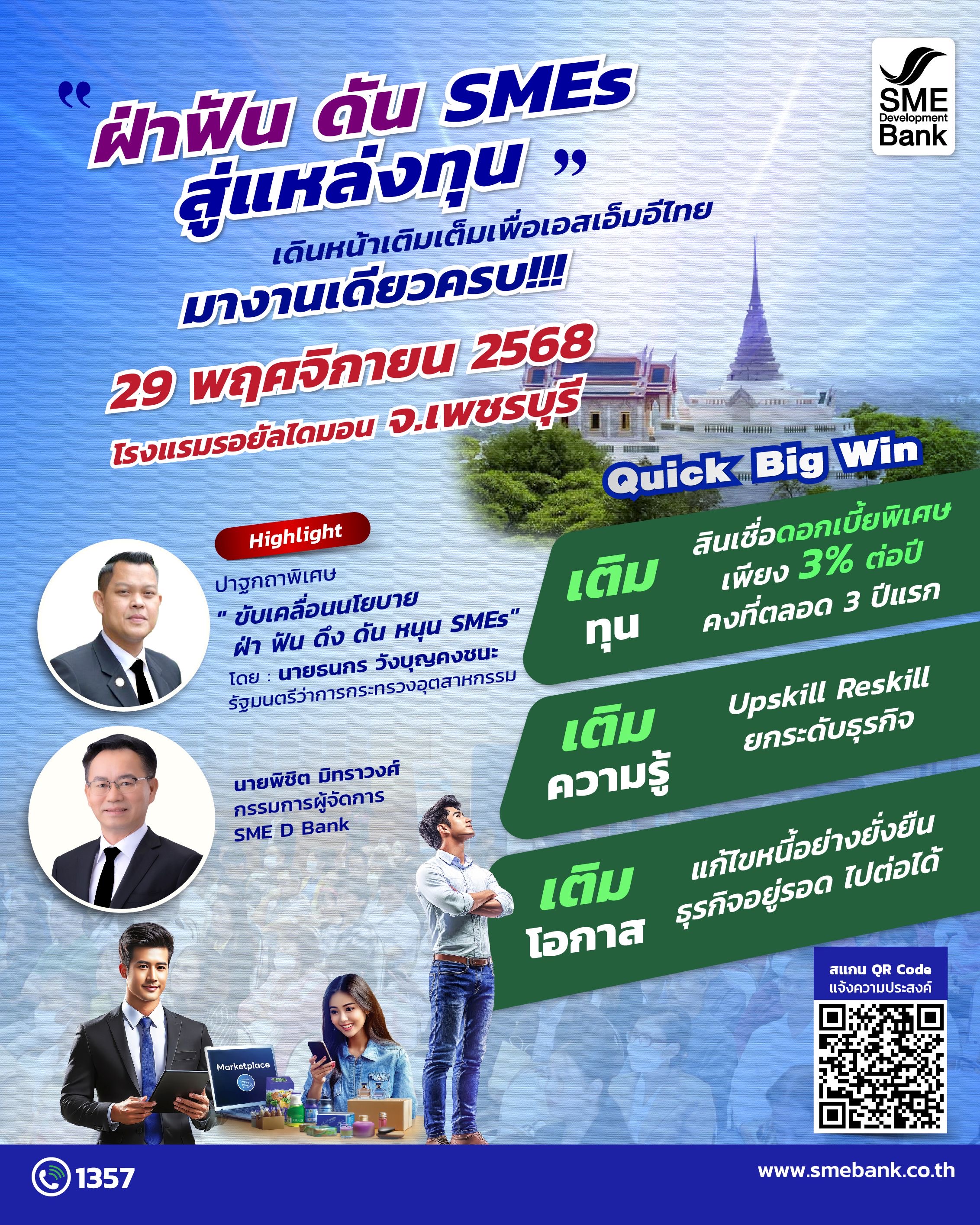 ธนาคารพัฒนาวิสาหกิจขนาดกลางและขนาดย่อมแห่งประเทศไทย (ธพว.) หรือ SME D Bank เดินหน้าเต็มกำลังขับเคลื่อนนโยบาย “Quick Big Win” ของรัฐบาล สนับสนุนผู้ประกอบการเอสเอ็มอี เดินหน้าคว้าโอกาสธุรกิจเติบโตช่วงโค้งสุดท้ายปี 2568 จัดกิจกรรม “ฝ่าฟัน ดัน SMEs สู่แหล่งทุน” มอบบริการ “3 เติม” ช่วยธุรกิจครบถ้วนในจุดเดียว ได้แก่ 1.“เติมทุน” เข้าถึงสินเชื่ออัตราดอกเบี้ยพิเศษเพียง 3% ต่อปี คงที่ตลอด 3 ปีแรก ผ่อนชำระนานสูงสุด 10 ปี วงเงินกู้สูงสุด 15 ล้านบาท ยื่นกู้ได้ทันทีในงาน 2. “เติมความรู้” ยกระดับกิจการ พัฒนาธุรกิจ Upskill Reskill ด้วยแพลตฟอร์ม DX by SME D Bank (dx.smebank.co.th) สะดวกสบาย ใช้บริการได้ตลอด 24 ชม. และ 3.“เติมโอกาสแก้ไขหนี้อย่างยั่งยืน” ด้วยมาตรการ “3 ลด ปลดหนี้” ช่วยลดภาระการเงิน สร้างโอกาสพลิกฟื้นกิจการ