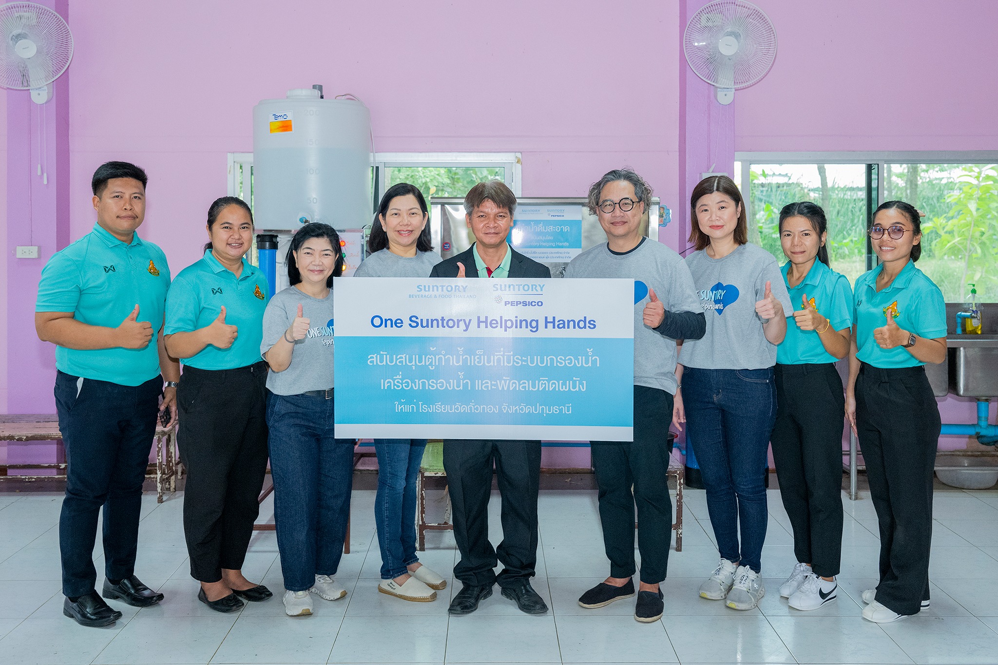 นายยศยุต สหวัชรินทร์ รองประธานบริหารอาวุโสฝ่ายทรัพยากรมนุษย์และบรรษัทสัมพันธ์ บริษัท ซันโทรี่ เป๊ปซี่โคเบเวอเรจ (ประเทศไทย) จำกัด กล่าวว่า “กิจกรรม ‘One Suntory Helping Hands 2025’ สะท้อนให้เห็นถึงการนำ ค่านิยมองค์กร ‘การตอบแทนกลับคืนสู่สังคม” (Giving Back to Society) ของกลุ่มบริษัทซันโทรี่ มาปฏิบัติให้เกิดขึ้นอย่างเป็นรูปธรรม โดยเปิดโอกาสให้เพื่อนพนักงานได้ร่วมระดมทุนผ่านกิจกรรม ‘One Suntory Bring & Buy’ ซึ่งเราสามารถระดมทุนได้มากถึง 1.2 ล้านบาท เพิ่มขึ้นกว่าปีแรกที่เริ่มต้นโครงการกว่าเท่าตัว สะท้อนให้เห็นถึง ‘พลังแห่งการให้’ ของพนักงาน ‘วัน ซันโทรี่’ ที่มีความตั้งใจจริงเพื่อร่วมกันสร้างประโยชน์ให้กับสังคม สำหรับปีนี้ เราได้นำเงินส่วนหนึ่งจากการระดมทุนไปจัดซื้อตู้ทำน้ำเย็นที่มีระบบกรองน้ำ เครื่องกรองน้ำดื่มสะอาด และถังเก็บน้ำ ให้แก่โรงเรียนวัดถั่วทอง จังหวัดปทุมธานี ซึ่งได้รับการพิจารณาให้ความช่วยเหลือเป็นแห่งแรกภายใต้โครงการนี้ พร้อมทั้งนำพนักงานจิตอาสาลงพื้นที่เพื่อปรับปรุงอาคารโรงเรียน สร้างสภาพแวดล้อมในการเรียนที่เหมาะสมและปลอดภัย ตลอดจนยกระดับคุณภาพชีวิตของเยาวชนผู้ด้อยโอกาส โดยบริษัทจะพิจารณาให้ความช่วยเหลือแก่โรงเรียนและมูลนิธิในจังหวัดระยอง สระบุรี ชลบุรี นครปฐม และกรุงเทพฯ”