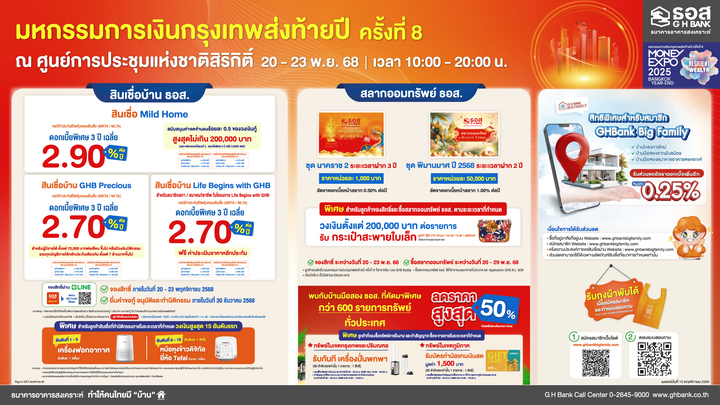 งาน “มหกรรมการเงินกรุงเทพส่งท้ายปี ครั้งที่ 8 (MONEY EXPO 2025 BANGKOK - YEAR END)” จัดขึ้นระหว่างวันที่ 20 - 23 พฤศจิกายน 2568 ณ ศูนย์การประชุมแห่งชาติสิริกิติ์ สามารถสอบถามรายละเอียด เพิ่มเติมได้ที่ ธอส. ทุกสาขาทั่วประเทศ G H Bank Call Center โทร 0-2645-9000, Website : www.ghbank.co.th หรือ Facebook Fanpage ธนาคารอาคารสงเคราะห์ และติดตามข่าวสารของธนาคารได้ที่ GHBank Social Media