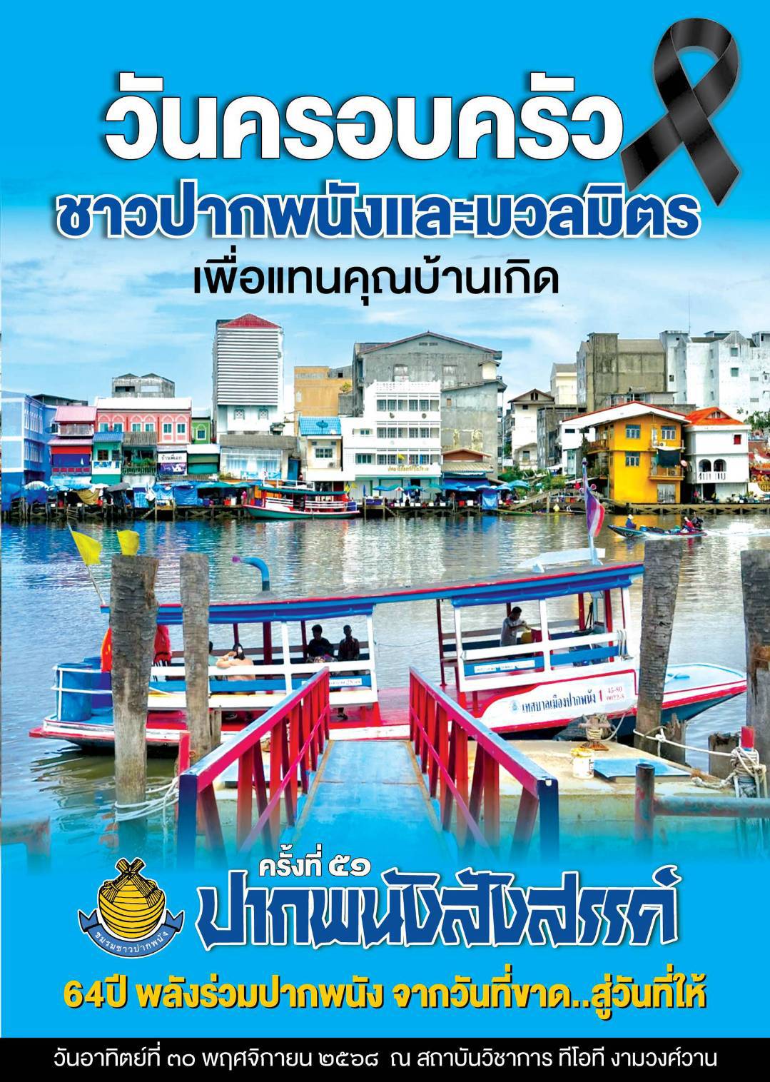 มูลนิธิชมรมชาวปากพนัง จัดงานวันครอบครัวชาวปากพนังและมวลมิตร "ปากพนังสังสรรค์" ครั้งที่ 51 ประจำปี 2568 เพื่อระดมทุนการศึกษาให้กับนักเรียน ในวันอาทิตย์ที่ 30 พฤศจิกายน 2568 ที่สถาบันวิชาการทีโอที งามวงศ์วาน 17 นนทบุรี เวลา 11.00-16.00 น.