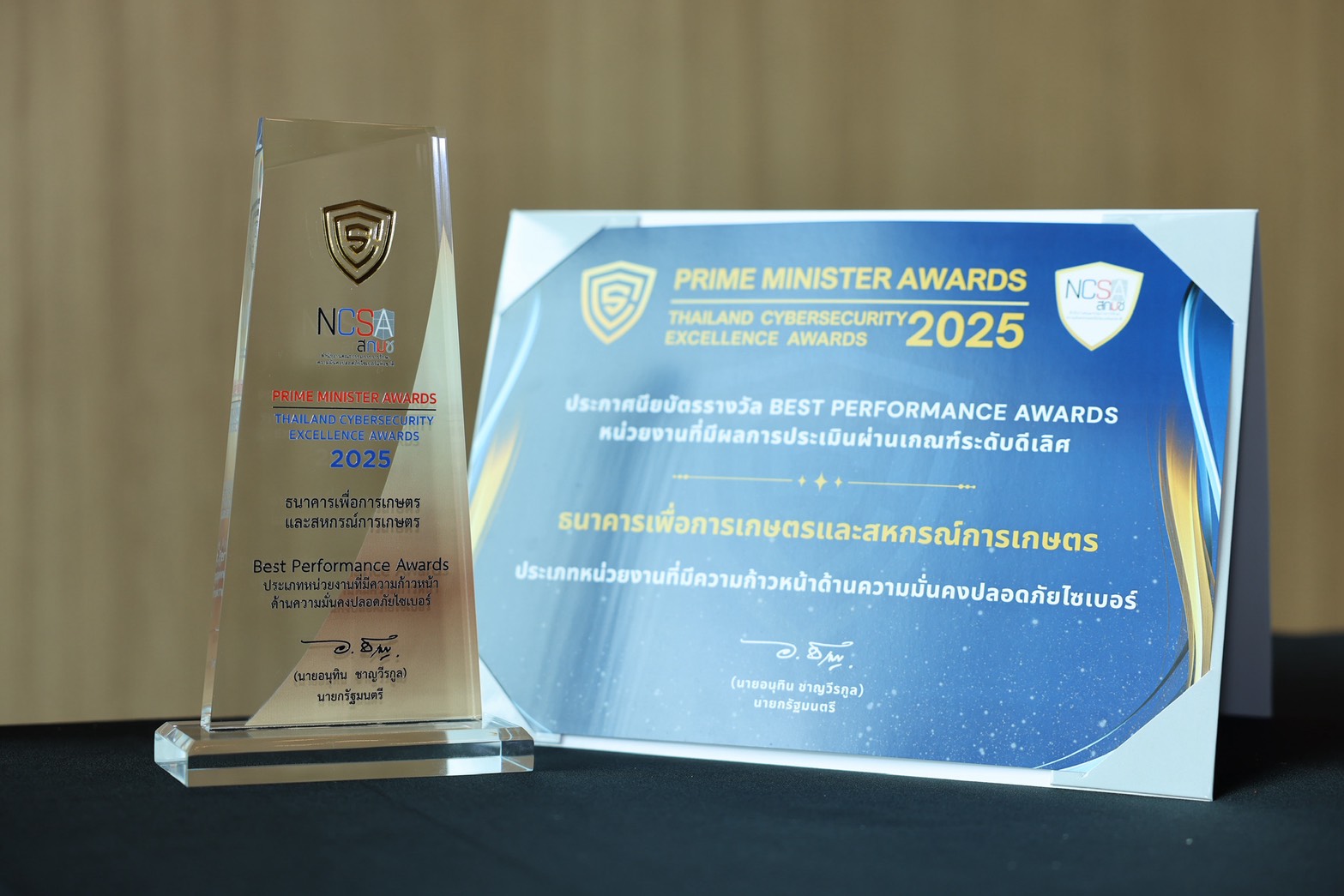 มอบโล่รางวัลเกียรติยศ Best Performance Award ในงาน Prime Minister Awards: Thailand Cybersecurity Excellence Awards 2025 ที่จัดขึ้นโดยสำนักงานคณะกรรมการการรักษาความมั่นคงปลอดภัยไซเบอร์แห่งชาติ (สกมช.) ซึ่งรางวัลดังกล่าวสะท้อนถึงการเป็นหน่วยงานรัฐที่มีผลงานโดดเด่นระดับชาติในด้านการรักษาความมั่นคงปลอดภัยไซเบอร์ โดย ธ.ก.ส. จะมุ่งมั่นพัฒนาและเสริมสร้างระบบรักษาความมั่นคงปลอดภัยไซเบอร์ให้มีประสิทธิภาพและปลอดภัยยิ่งขึ้นต่อไป โดยมีนายพิพัฒน์ รัชกิจประการ รองนายกรัฐมนตรีและรัฐมนตรีว่าการกระทรวงคมนาคมเป็นประธานในพิธีมอบรางวัล ณ ห้อง Diamond Ballroom 1-2 ชั้น 4 โรงแรมแกรนด์ ริชมอนด์ สไตลิช คอนเวนชั่น จังหวัดนนทบุรี เมื่อวันที่ 20 พฤศจิกายน 2568