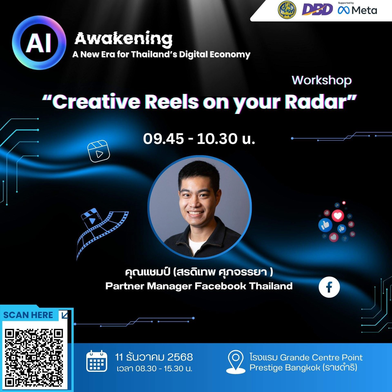 กรมพัฒนาธุรกิจการค้า และ Facebook ประเทศไทย ได้ร่วมกันจัดงาน “AI Awakening : A New Era for Thailand’s Digital Economy” ในวันพฤหัสบดีที่ 11 ธันวาคม 2568 ณ โรงแรมแกรนด์ เซนเตอร์พอยต์ เพรสทีจ กรุงเทพมหานคร โดยได้รับเกียรติจาก รัฐมนตรีว่าการกระทรวงพาณิชย์ (นางศุภจี สุธรรมพันธุ์) และผู้บริหารระดับภูมิภาคของ บริษัท เฟซบุ๊ก (ประเทศไทย) จำกัด ร่วมเสวนา หัวข้อ “Thailand’s Vision for Smart Commerce : Innovation, Inclusion, and Internationalization” เพื่อสร้างแรงบันดาลใจในการพัฒนาธุรกิจ พร้อมทั้ง Workshop แบบเข้มข้น และอัปเดตเทรนด์การตลาดออนไลน์ อาทิ (1) Workshop “Meta AI & Ads Solutions for SME Growth” โดยคุณมัณฑิตา จินดา ผู้ก่อตั้ง Digital Tips Academy (2) การเสวนา “Decode AI Thailand : ปลดล็อกข้อจำกัด สู่โอกาสเศรษฐกิจดิจิทัล” โดย Startup ด้านเทคโนโลยีชั้นนำของไทย และ (3) การบรรยายหัวข้อ “Creative Reels on Your Radar” จากทีมผู้เชี่ยวชาญของ Meta ประเทศไทย