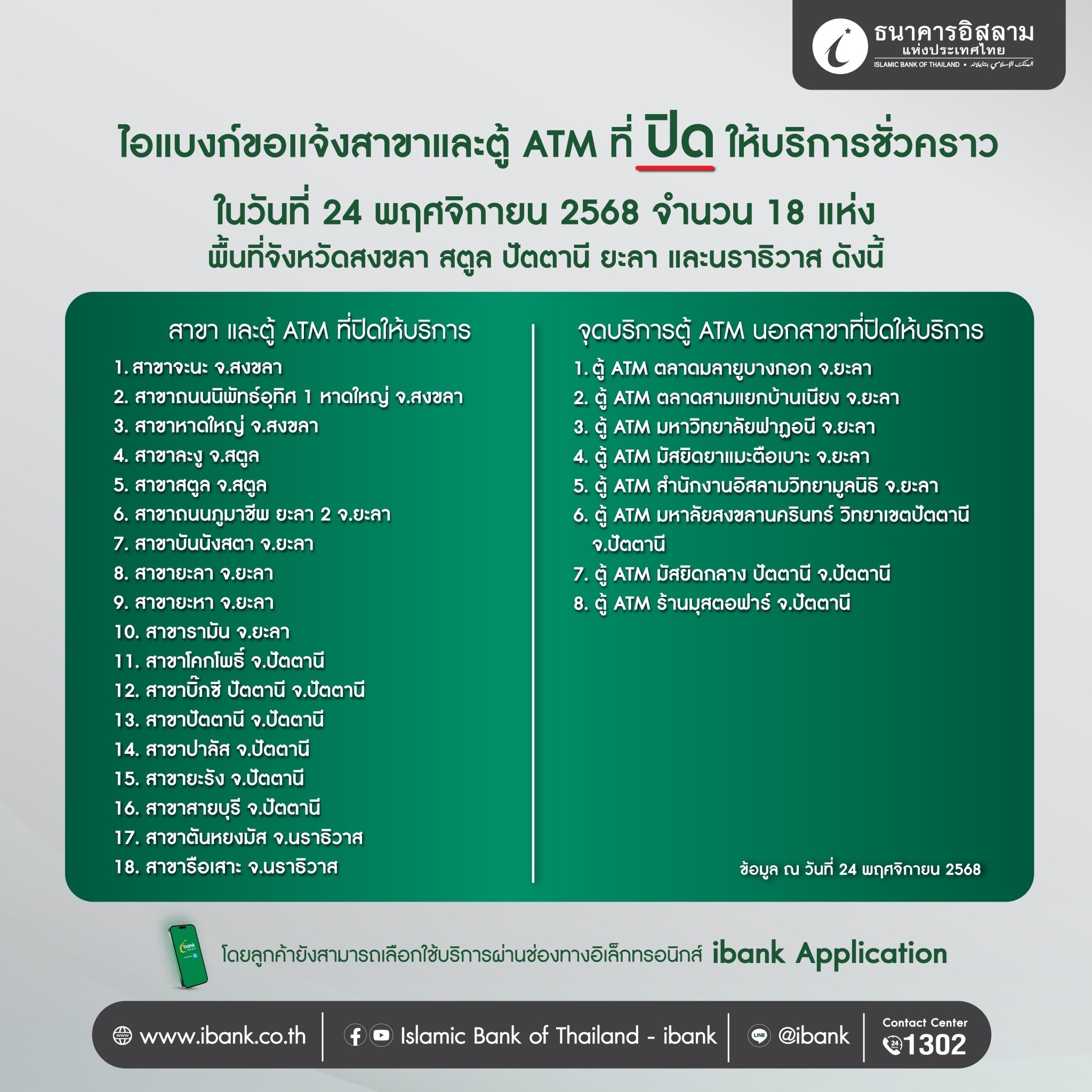 นายธีระ ยีโกบ ผู้ช่วยกรรมการผู้จัดการ ผู้บริหารกลุ่มงานธุรกิจสาขา เปิดเผยว่า ธนาคารมีความห่วงใยอย่างยิ่งต่อสถานการณ์น้ำท่วมในพื้นที่ภาคใต้ ซึ่งส่งผลกระทบต่อการเดินทางและความปลอดภัยในชีวิตและทรัพย์สินของพี่น้องประชาชน เพื่อความปลอดภัยสูงสุด ธนาคารจึงมีความจำเป็นต้องปิดให้บริการสาขาและตู้ ATM เป็นการชั่วคราว ในวันจันทร์ที่ 24 พฤศจิกายน 2568 จำนวน 18 แห่ง ในพื้นที่จังหวัดสงขลา สตูล ยะลา ปัตตานี และนราธิวาส ดังนี้