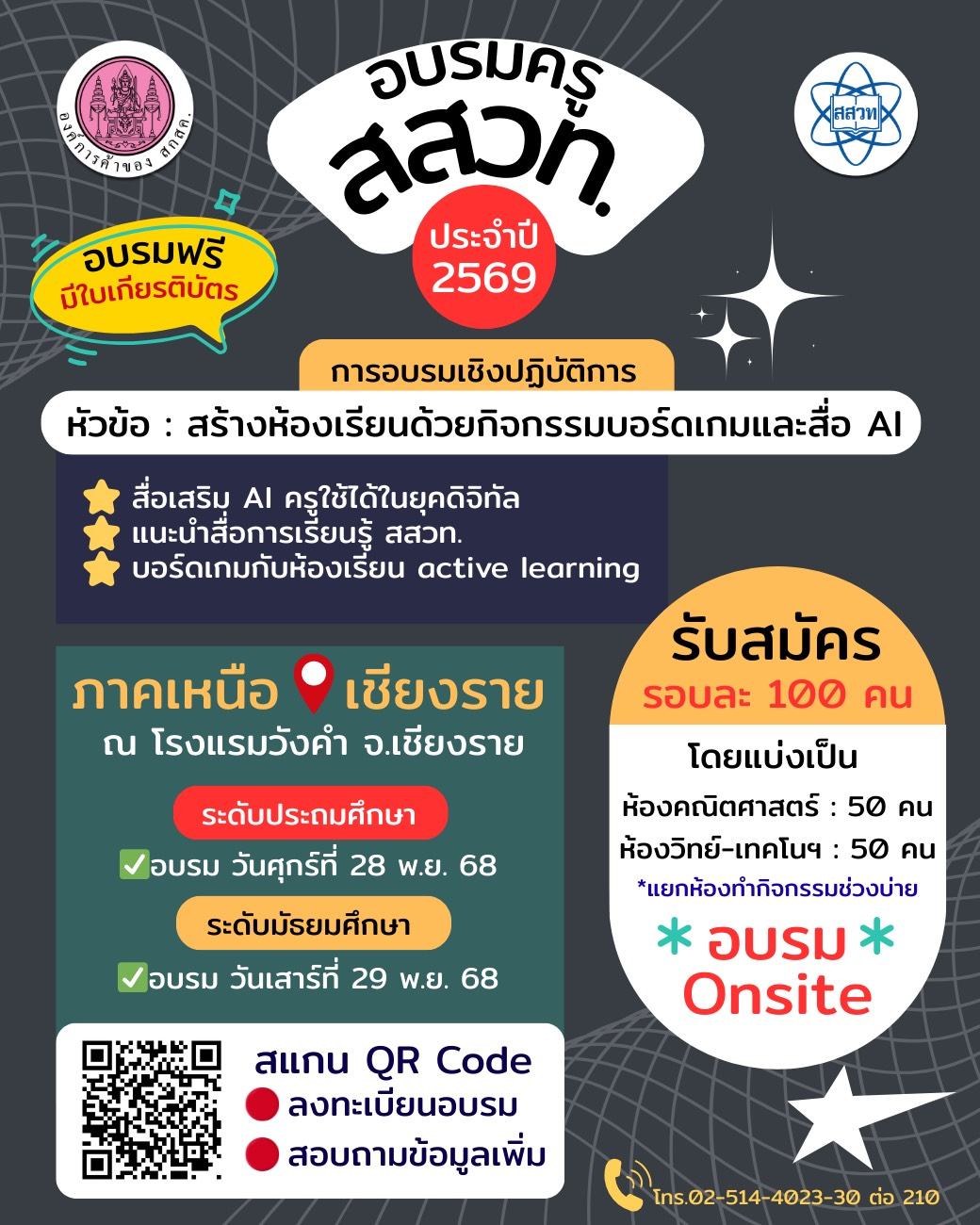 สถาบันส่งเสริมการสอนวิทยาศาสตร์และเทคโนโลยี (สสวท.) ร่วมกับองค์การค้าของ สกสค. เปิดรับสมัครครูที่สังกัดโรงเรียนในพื้นที่ภาคเหนือ เข้าร่วมอบรมเชิงปฏิบัติการ หัวข้อ “สร้างห้องเรียนด้วยกิจกรรมบอร์ดเกมและสื่อ AI” เพื่อยกระดับทักษะครูยุคดิจิทัลในการออกแบบการสอนแบบ Active Learning ด้วยสื่อ AI และบอร์ดเกม โดยระดับประถมศึกษา อบรมวันที่ 28 พ.ย. 68 และระดับมัธยมศึกษา อบรมวันที่ 29 พ.ย. 68 ณ โรงแรมวังคำ จ.เชียงราย แบ่งกลุ่มอบรมตามสาขา ได้แก่ คณิตศาสตร์ 50 คน และ วิทยาศาสตร์–เทคโนโลยี 50 คน รวม 100 คน อบรมฟรี พร้อมรับเกียรติบัตร ดูรายละเอียด และสอบถามเพิ่มเติมได้ที่