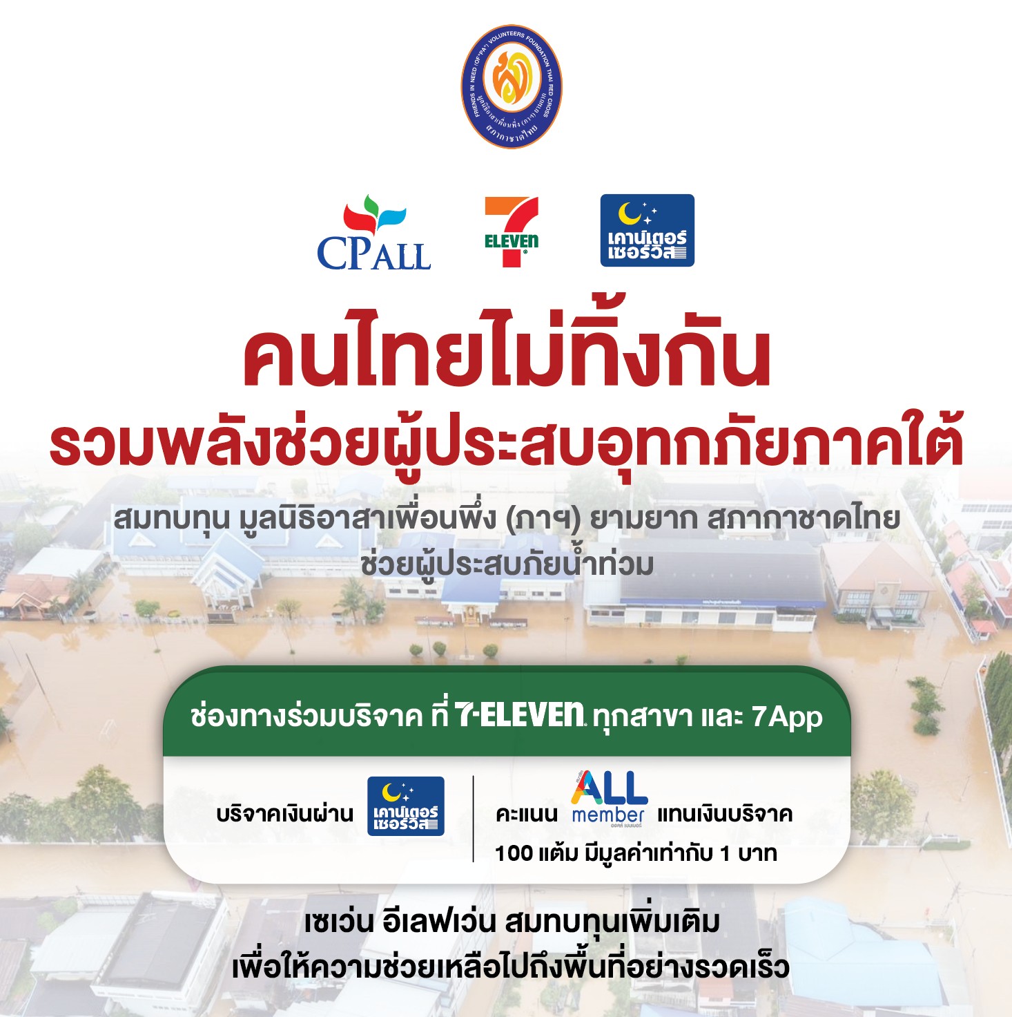 ซีพี ออลล์ และ เซเว่น อีเลฟเว่น พร้อมอยู่เคียงข้างพี่น้องชาวไทยทุกคน เพราะ "คนไทยไม่ทิ้งกัน" ขอเชิญชวนทุกคนร่วมส่งต่อพลังน้ำใจ แม้เพียงเล็กน้อยก็มีความหมายต่อผู้ประสบภัยอย่างยิ่ง เพราะทุกคะแนนที่คุณให้คือกำลังใจส่งให้พี่น้องผู้ประสบภัยทุกคน