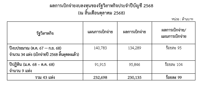 นายธิบดี วัฒนกุล ผู้อำนวยการสำนักงานคณะกรรมการนโยบายรัฐวิสาหกิจ (สคร.) เปิดเผยว่า การเบิกจ่ายงบลงทุนของรัฐวิสาหกิจที่อยู่ในกำกับของ สคร. จำนวน 43 แห่ง ได้แก่ รัฐวิสาหกิจที่ใช้ปีบัญชีตามปีงบประมาณ (รัฐวิสาหกิจปีงบประมาณ) จำนวน 34 แห่ง และรัฐวิสาหกิจที่ใช้ปีบัญชีตามปีปฏิทิน (รัฐวิสาหกิจปีปฏิทิน) จำนวน 9 แห่ง มีการเบิกจ่ายงบลงทุนจนถึงเดือนตุลาคม 2568 แล้วจำนวน 230,135 ล้านบาท หรือคิดเป็นร้อยละ 99 ของแผนการเบิกจ่าย แยกเป็นการเบิกจ่ายงบลงทุนของรัฐวิสาหกิจปีงบประมาณ (ตั้งแต่เดือนตุลาคม 2567 - เดือนกันยายน 2568 ซึ่งได้สิ้นสุดการเบิกจ่ายงบลงทุนประจำปี 2568 แล้วจำนวน 134,289 ล้านบาท หรือคิดเป็นร้อยละ 95 ของแผนการเบิกจ่าย และรัฐวิสาหกิจปีปฏิทิน (เดือนมกราคม 2568 - เดือนตุลาคม 2568) จำนวน 95,846 ล้านบาท หรือคิดเป็นร้อยละ 104 ของแผนการเบิกจ่าย ทั้งนี้ รัฐวิสาหกิจปีงบประมาณที่เบิกจ่ายได้ไม่ต่ำกว่าร้อยละ 95 ของแผนการเบิกจ่ายและมีมูลค่าสูงสุด 3 อันดับ ได้แก่ การรถไฟแห่งประเทศไทย (รฟท.) การรถไฟฟ้าขนส่งมวลชนแห่งประเทศไทย (รฟม.) และการประปานครหลวง (กปน.) และรัฐวิสาหกิจปีปฏิทินที่เบิกจ่ายได้ไม่ต่ำกว่าร้อยละ 95 ของแผนการเบิกจ่ายและมีมูลค่าสูงสุด 3 อันดับ ได้แก่ การไฟฟ้าส่วนภูมิภาค การไฟฟ้าฝ่ายผลิตแห่งประเทศไทย และการไฟฟ้านครหลวง