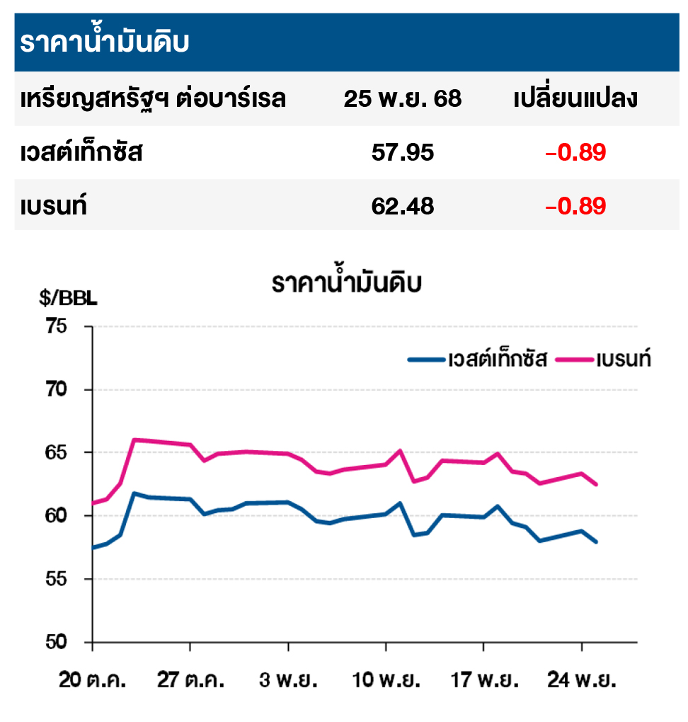 (-) สำนักข่าวของสหรัฐฯ รายงานว่า ยูเครนได้ตอบตกลงในเงื่อนไขของข้อตกลงสันติภาพ ขณะที่หัวหน้าความมั่นคงแห่งชาติของยูเครนกล่าวว่า โวโลดิเมียร์ เซเลนสกี ประธานาธิบดีของยูเครนอาจเดินทางไปเยือนสหรัฐฯ ในอีกไม่กี่วันข้างหน้า เพื่อสรุปข้อตกลงร่วมกับโดนัลด์ ทรัมป์ ประธานาธิบดีของสหรัฐฯ ในการยุติสงครามกับรัสเซีย อย่างไรก็ดี ตลาดยังคงจับตาความเคลื่อนไหวของฝั่งรัสเซียที่ยังไม่ชัดเจนว่าเห็นด้วยกับข้อตกลงดังกล่าวหรือไม่ ทั้งนี้ หากทั้งสองประเทศบรรลุข้อตกลงสันติภาพ และ มาตรการคว่ำบาตรรัสเซียถูกยกเลิก อุปทานน้ำมันที่ถูกจำกัดจะกลับเข้าสู่ตลาด ซึ่งคาดว่าจะเป็นแรงกดดันสำคัญต่อราคาน้ำมัน