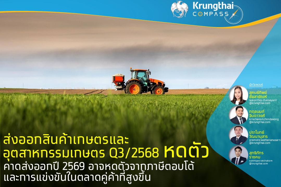 Krungthai COMPASS มองว่า การส่งออกสินค้าเกษตรและอุตสาหกรรมเกษตรในปี 2569-2570 อาจมีแนวโน้มหดตัว จากภาษีตอบโต้และการแข่งขันในตลาดคู่ค้าที่สูงขึ้น โดยเฉพาะในกลุ่มสินค้าข้าว อาหารทะเลกระป๋องและแปรรูป อาหารสัตว์เลี้ยง รวมทั้งยังมีปัจจัยที่ต้องติดตาม ดังนี้