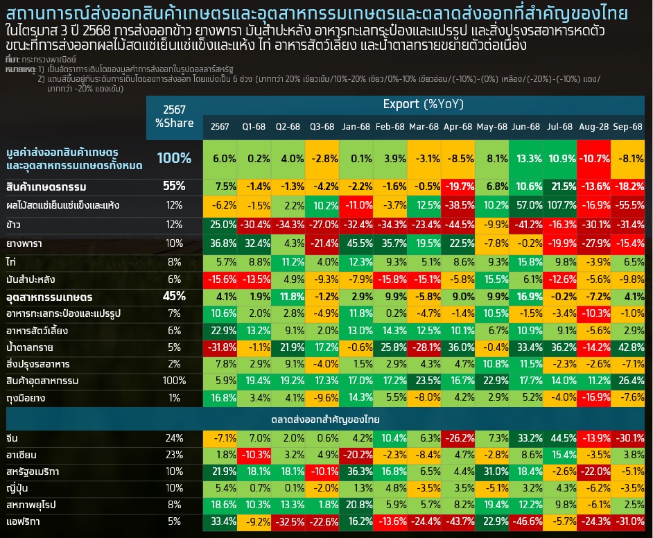 • มูลค่าการส่งออกสินค้าเกษตรและอุตสาหกรรมเกษตรในไตรมาส 3 ปี 2568 อยู่ที่ 13,121 ล้านดอลลาร์สหรัฐ (ราว 4.2 แสนล้านบาท) หดตัว -2.8%YoY หลังจากไตรมาสก่อนที่ขยายตัว 4.0%YoY โดยสินค้าสำคัญที่หดตัว ได้แก่ ข้าว ยางพารา มันสำปะหลัง อาหารทะเลกระป๋องและแปรรูป และสิ่งปรุงรสอาหาร ส่วนสินค้าสำคัญที่ขยายตัวต่อเนื่อง ได้แก่ ผลไม้สดแช่เย็นแช่แข็งและแห้ง ไก่ อาหารสัตว์เลี้ยง และน้ำตาลทราย