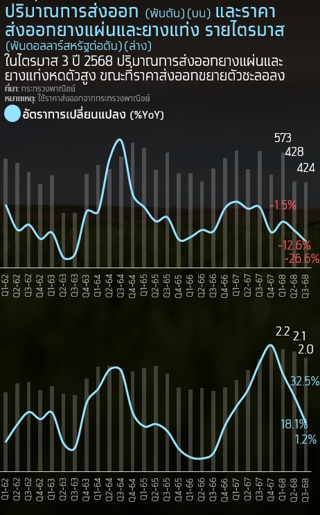 มูลค่าการส่งออกยางแผ่นและยางแท่งไตรมาส 3 ปี 2568 หดตัวสูงถึง -25.7%YoY จากปริมาณการส่งออกที่หดตัว -26.6%YoY เนื่องจากการส่งออกไปจีนซึ่งคิดเป็นสัดส่วน 32% ของการส่งออกยางแผ่นและยางแท่งทั้งหมดของไทยหดตัว -19.5%YoY จากผลกระทบของมาตรการปรับขึ้นภาษีนำเข้ารถยนต์และชิ้นส่วนรถยนต์ของสหรัฐฯ ในอัตรา 25% ที่มีผลบังคับใช้ตั้งแต่วันที่ 2 เม.ย. 2568 ทำให้ความต้องการนำเข้ายางล้อในสหรัฐฯ ลดลง ส่งผลให้ความต้องการนำเข้ายางแผ่นและยางแท่งของจีนจากไทยเพื่อเป็นวัตถุดิบในการผลิตยางล้อส่งออกไปสหรัฐฯ ปรับตัวลดลง