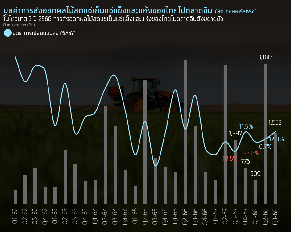 1 มูลค่าการส่งออกผลไม้สดแช่เย็นแช่แข็งและแห้งไปจีนเฉลี่ย 3 ปี (2565-2567) คิดเป็นสัดส่วน 88% ของการส่งออกผลไม้สดแช่เย็นแช่แข็งและแห้งของไทย
