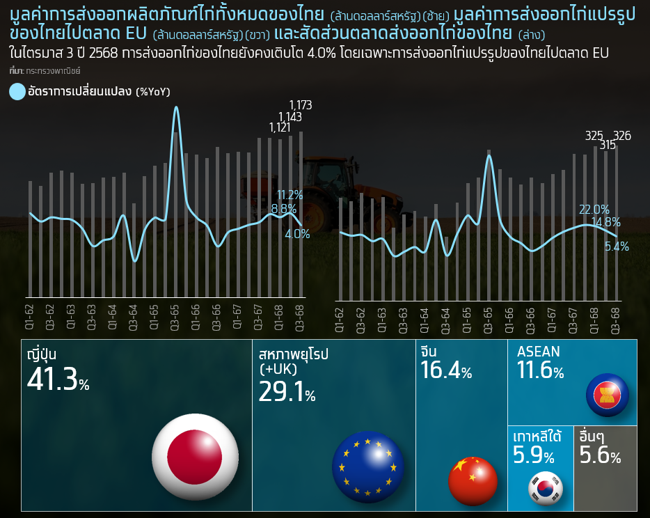 ภาพรวมมูลค่าการส่งออกไก่สดแช่เย็นแช่แข็งและแปรรูปไตรมาส 3 ปี 2568 ขยายตัว 4.0%YoY โดยเฉพาะไก่แปรรูปขยายตัว 5.4%YoY3 จากตลาดส่งออกหลักอย่างสหภาพยุโรปที่ขยายตัว 5.4%YoY เช่นเดียวกับราคาส่งออกไก่แปรรูปที่ขยายตัว 4.9%YoY เพราะความต้องการนำเข้าไก่แปรรูปที่เพิ่มขึ้นตามการเติบโตของการท่องเที่ยวและธุรกิจร้านอาหาร