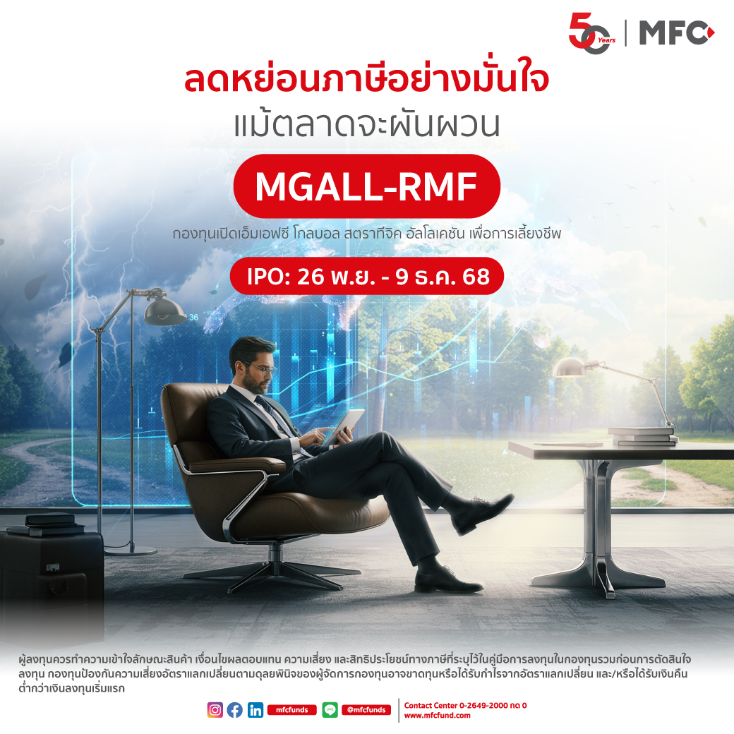 สำหรับกองทุน MGALL-RMF เป็นกองทุนรวมผสมต่างประเทศ ประเภท Feeder Fund เพื่อการเลี้ยงชีพมีระดับความเสี่ยง 5 เปิดเสนอขายครั้งแรก (IPO) วันที่ 26 พฤศจิกายน – 9 ธันวาคม 2568 เงินลงทุนขั้นต่ำครั้งแรก 1,000 บาท ครั้งต่อไป 500 บาท กองทุนไม่กำหนดอายุโครงการ สามารถซื้อและขายคืนหน่วยลงทุนได้ทุกวันทำการทั้งนี้ ผู้ลงทุนควรทำความเข้าใจลักษณะสินค้า เงื่อนไข ผลตอบแทน ความเสี่ยงและสิทธิประโยชน์ทางภาษีที่ระบุไว้ ในคู่มือการลงทุนในกองทุนรวม ก่อนการตัดสินใจลงทุน กองทุนป้องกันความเสี่ยงอัตราแลกเปลี่ยนตามดุลยพินิจของผู้จัดการกองทุนอาจขาดทุนหรือได้รับกำไรจากอัตราแลกเปลี่ยน และ/หรือได้รับเงินคืนต่ำกว่าเงินลงทุนเริ่มแรก ผู้ที่สนใจสอบถามข้อมูลและขอรับหนังสือชี้ชวนได้ที่ บลจ.เอ็มเอฟซี จำกัด (มหาชน) และตัวแทนสนับสนุนการขาย หรือ โทรศัพท์ 0-2649-2000 ติดต่อฝ่ายวางแผนการลงทุน กด 2 หรือ Contact Center กด 0 สาขาแจ้งวัฒนะ โทร. 0-2835-3055-57 สาขาปิ่นเกล้า โทร. 0-2014-3150-2 สาขาขอนแก่น โทร. 043-204-014-16 สาขาเชียงใหม่ โทร.0-5321-8480-82 สาขาระยอง โทร. 033-100-340 สาขาหาดใหญ่ โทร.074-232-324-25 หรือที่ www.mfcfund.com