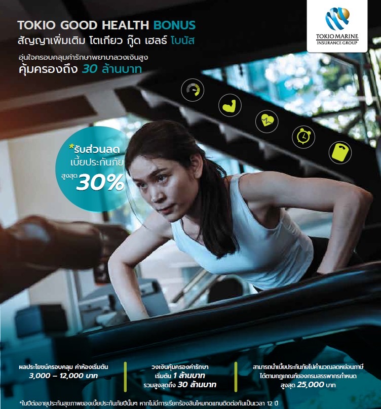 บมจ.โตเกียวมารีนประกันชีวิต (ประเทศไทย) เปิดตัวสัญญาเพิ่มเติมประกันสุขภาพรูปแบบใหม่ "โตเกียว กู๊ด เฮลธ์ โบนัส" (Tokio Good Health Bonus) มอบความคุ้มครองค่ารักษาพยาบาลวงเงินสูงเริ่มต้น 1 ล้านบาท รวมสูงสุดถึง 30 ล้านบาท พร้อมผลประโยชน์ส่วนลดเบี้ยสำหรับผู้ที่ดูแลสุขภาพดี
