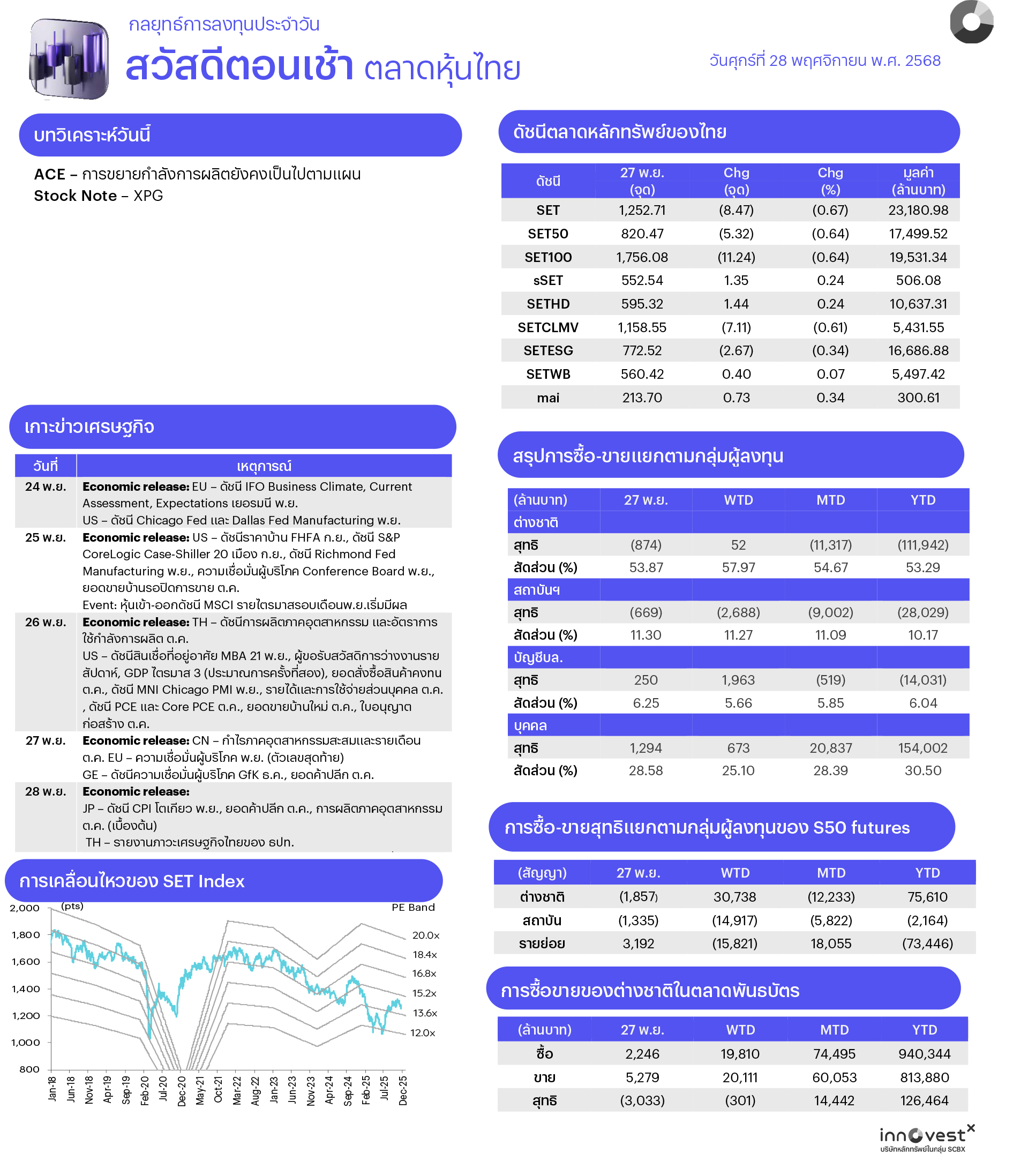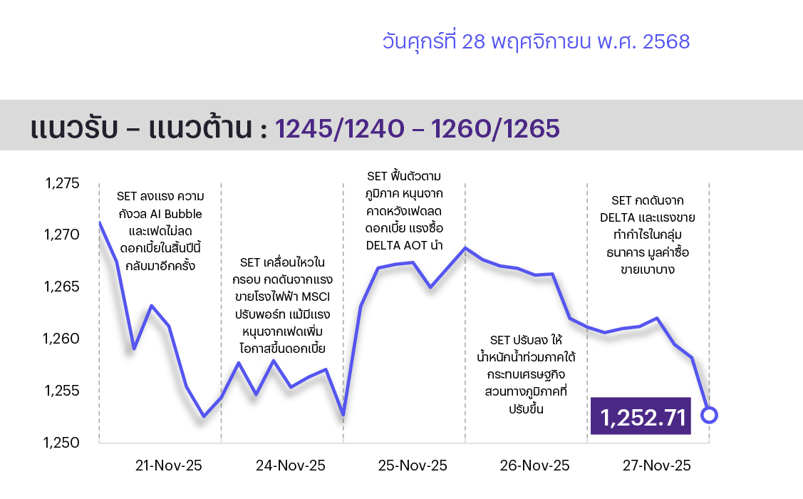 คาดตลาดแกว่งซึมในกรอบแคบ มูลค่าซื้อขายคาดเบาบางต่อ ปัจจัยในประเทศเริ่มดีขึ้นหลังน้ำท่วมภาคใต้เริ่มคลี่คลาย โดยคาด ครม. จะพิจารณามาตรการเยียวยาในสัปดาห์หน้า ขณะที่ปัจจัยต่างประเทศสัปดาห์หน้าให้น้ำหนักไปที่การรายงานดัชนี PCE สหรัฐฯ เดือน ก.ย. ซึ่งจะบ่งชี้แนวโน้มดอกเบี้ยเฟด ทางเทคนิคดัชนีหลุดเส้น 200 วันลงมาทดสอบใกล้ Low เดิม หากไม่หลุดอาจรีบาวด์ได้เพียงระยะสั้น แต่หากหลุดมีโอกาสร่วงลงต่อเนื่อง แนวรับ 1245/1240 แนวต้าน 1260/1265