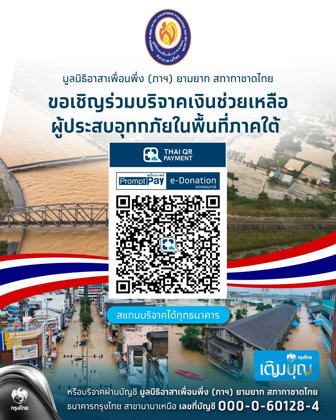 นอกจากนี้ ธนาคารร่วมกับ มูลนิธิอาสาเพื่อนพึ่ง (ภาฯ) ยามยาก สภากาชาดไทย เปิดรับบริจาคจากผู้มีจิตศรัทธา เพื่อส่งต่อความช่วยเหลือให้แก่ผู้ประสบอุทกภัย ผ่านมูลนิธิอาสาเพื่อนพึ่ง (ภาฯ) ยามยากสภากาชาดไทย ด้วยการสแกน QR Code E-Donation ผ่านแอปพลิเคชันของทุกธนาคาร ซึ่งข้อมูลการบริจาคจะส่งเข้าระบบลดหย่อนภาษีของกรมสรรพากรอัตโนมัติ หรือ บริจาคผ่านบัญชี ออมทรัพย์ ชื่อบัญชีมูลนิธิอาสา เพื่อนพึ่ง (ภาฯ) ยามยาก สภากาชาดไทย ธนาคารกรุงไทย สาขานานาเหนือ เลขที่ 000-0-601-28-4 หรือดูรายละเอียดเพิ่มเติมได้ที่ https://krungthai.com/link/edonation-flood2025