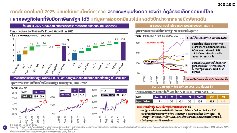 ส่งออกสินค้าขยายตัวสูง โดยเฉพาะทองคำและอิเล็กทรอนิกส์ ท่ามกลางเศรษฐกิจโลกที่รับมือภาษีนำเข้าสหรัฐฯ ได้ดีกว่าคาด