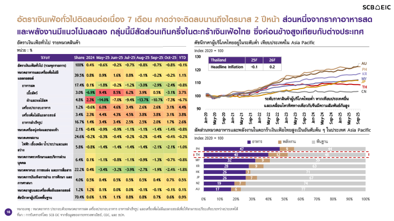 การลงทุนภาคเอกชนจะยังขยายตัวได้จากการนำเข้าเครื่องจักรและสินค้าทุน แต่อาจส่งผลดีต่อเศรษฐกิจไม่มาก เนื่องจาก Import content ของไทยสูงขึ้นมากจากอดีต สะท้อนจากการนำเข้าของไทยที่สูงขึ้นมาก โดยเฉพาะจากจีน จึงอาจไม่ได้สร้างประโยชน์ต่อภาคการผลิตไทย และเป็นความเสี่ยงเพิ่มเติมต่อประเด็น Transshipment tariff กับสหรัฐฯ ขณะที่นักท่องเที่ยวต่างชาติที่เดินทางมาไทยทยอยฟื้นตัว แต่ภาคท่องเที่ยวยังต้องเผชิญความท้าทายจากการฟื้นตัวของนักท่องเที่ยวจีนที่ค่อนข้างช้า สำหรับอัตราเงินเฟ้อทั่วไปติดลบนานต่อเนื่อง 7 เดือน และคาดว่าจะติดลบจนถึงไตรมาส 2 ปี 2569 ส่วนหนึ่งจากราคาอาหารสดและพลังงานมีแนวโน้มลดลง สินค้ากลุ่มนี้มีสัดส่วนเกินครึ่งในตะกร้าเงินเฟ้อไทย ซึ่งค่อนข้างสูงเทียบต่างประเทศ