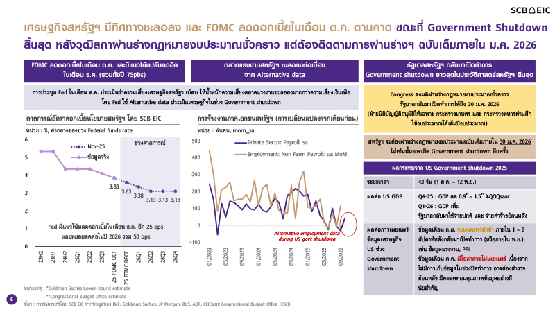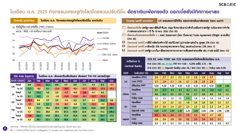 สหรัฐฯ – จีนบรรลุข้อตกลงการค้าชั่วคราว แต่นโยบายภาษีนำเข้าสหรัฐฯ ยังไม่แน่นอนสูง สหรัฐฯ-จีนเจรจาการค้าในช่วงปลายเดือน ต.ค. ตกลงลดกำแพงภาษีอัตราสูงระหว่างกันชั่วคราว และจีนจะกลับมาส่งออก Rare earth ให้ผู้ผลิตสหรัฐฯ โดยข้อตกลงนี้มีอายุ 1 ปี จึงยังต้องติดตามพัฒนาการสงครามการค้าระหว่างสองมหาอำนาจต่อไป นอกจากนี้ ศาลสูงสุดสหรัฐฯ มีโอกาสตัดสินให้การบังคับใช้กำแพงภาษีนำเข้าบางส่วนของรัฐบาลทรัมป์ไม่ชอบด้วยกฎหมาย ซึ่งจะทำให้รัฐบาลทรัมป์ต้องใช้ข้อกฎหมายอื่น ๆ ในการคงกำแพงภาษีไว้ เป็นปัจจัยเพิ่มความไม่แน่นอนของนโยบายภาษีนำเข้าสหรัฐฯ ในระยะข้างหน้า