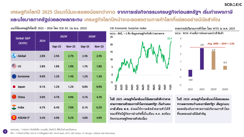 เศรษฐกิจโลกปี 2568 ขยายตัวดีกว่าคาด จากการค้าที่เร่งตัวก่อนสหรัฐฯ บังคับใช้กำแพงภาษี และเทรนด์การลงทุนที่เกี่ยวข้องกับ AI โดย SCB EIC มองว่าเศรษฐกิจโลกจะขยายตัวได้ 2.7%YOY (เดิม 2.5%YOY) เศรษฐกิจสหรัฐฯ จะได้รับผลดีจากการลงทุนที่เกี่ยวข้องกับ AI สำหรับเศรษฐกิจเอเชียจะได้รับผลดีจากการส่งออกสินค้าอิเล็กทรอนิกส์ และการ Front-load ส่งออกไปสหรัฐฯ ขณะที่เศรษฐกิจโลกปี 2569 จะชะลอลงตามการค้าโลกที่จะได้รับผลกระทบจากกำแพงภาษีสหรัฐฯ ชัดเจนขึ้น โดยเศรษฐกิจโลกปี 2569 จะขยายตัวชะลอลงอยู่ที่ 2.5%YOY โดยเฉพาะกลุ่มเศรษฐกิจเอเชียที่พึ่งพาการส่งออกไปตลาดสหรัฐฯ สูง อย่างไรก็ดี การลงทุนที่เกี่ยวข้องกับ AI แรงหนุนจากนโยบายการคลังและนโยบายการเงินที่ผ่อนคลายจะยังเป็นแรงขับเคลื่อนสำคัญของเศรษฐกิจโลกในปีหน้า