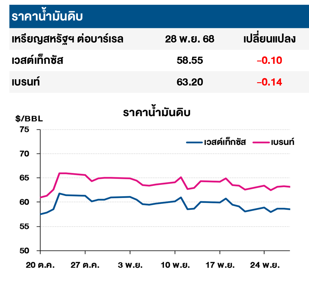(-) อุปทานน้ำมันดิบสหรัฐฯ เดือน ก.ย. 68 ปรับเพิ่มขึ้น 0.04 ล้านบาร์เรลต่อวัน สู่ระดับ 13.84 ล้านบาร์เรลต่อวัน ซึ่งเป็นระดับที่สูงที่สุดในเดือน ก.ย. 68ส่งผลให้ตลาดกังวลอุปทานน้ำมันดิบเข้าสู่ภาวะอุปทานล้นตลาด