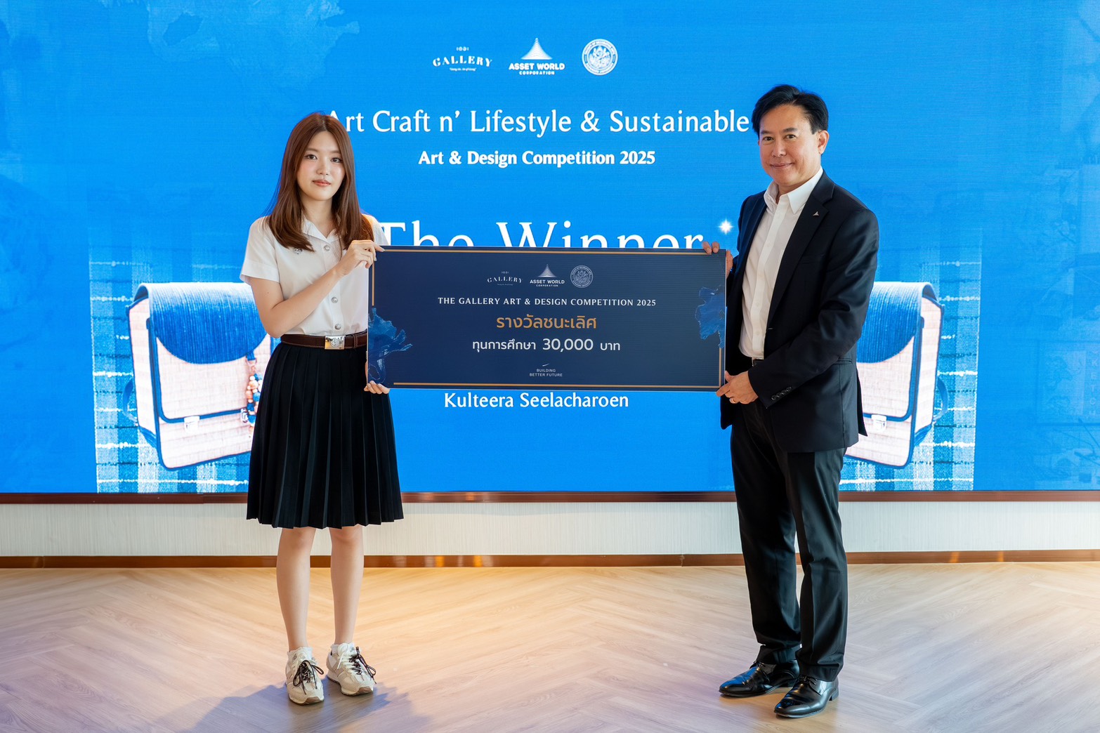ดร.สิเวศ โรจนสุนทร หัวหน้าคณะสายงานบริหารกลาง และรักษาการหัวหน้าคณะสายงานการตลาดเชิงกลยุทธ์และความยั่งยืน บริษัท แอสเสท เวิรด์ คอร์ปอเรชั่น (AWC) พร้อมผู้บริหาร AWC และรองศาสตราจารย์ ปนท ปลื้มชูศักดิ์ รองคณบดีฝ่ายกิจการนักศึกษาคณะมัณฑนศิลป์ มหาวิทยาลัยศิลปากร ร่วมงานประกาศผลและมอบรางวัลแก่ผู้ชนะในโครงการ The Gallery Art & Design Competition 2025 ทั้ง 9 ผลงานจาก 9 ทีม ที่สะท้อนถึงพลังความคิดสร้างสรรค์และความมุ่งมั่นของเยาวชนไทยในการพัฒนาศิลปะร่วมสมัยจากภูมิปัญญาท้องถิ่น ภายใต้โจทย์ Art Craft n’ Lifestyle & Sustainable ที่เปิดพื้นที่ให้นักศึกษาทั้ง 7 ภาควิชา ได้แสดงศักยภาพด้านการออกแบบ ผ่านการต่อยอดวัสดุ กรรมวิธี และแรงบันดาลใจจากชุมชนทั่วประเทศไทยนำภูมิปัญญาท้องถิ่นมาตีความใหม่เป็นผลงานร่วมสมัยที่สร้างประโยชน์กลับคืนสู่ชุมชนได้อย่างยั่งยืน
