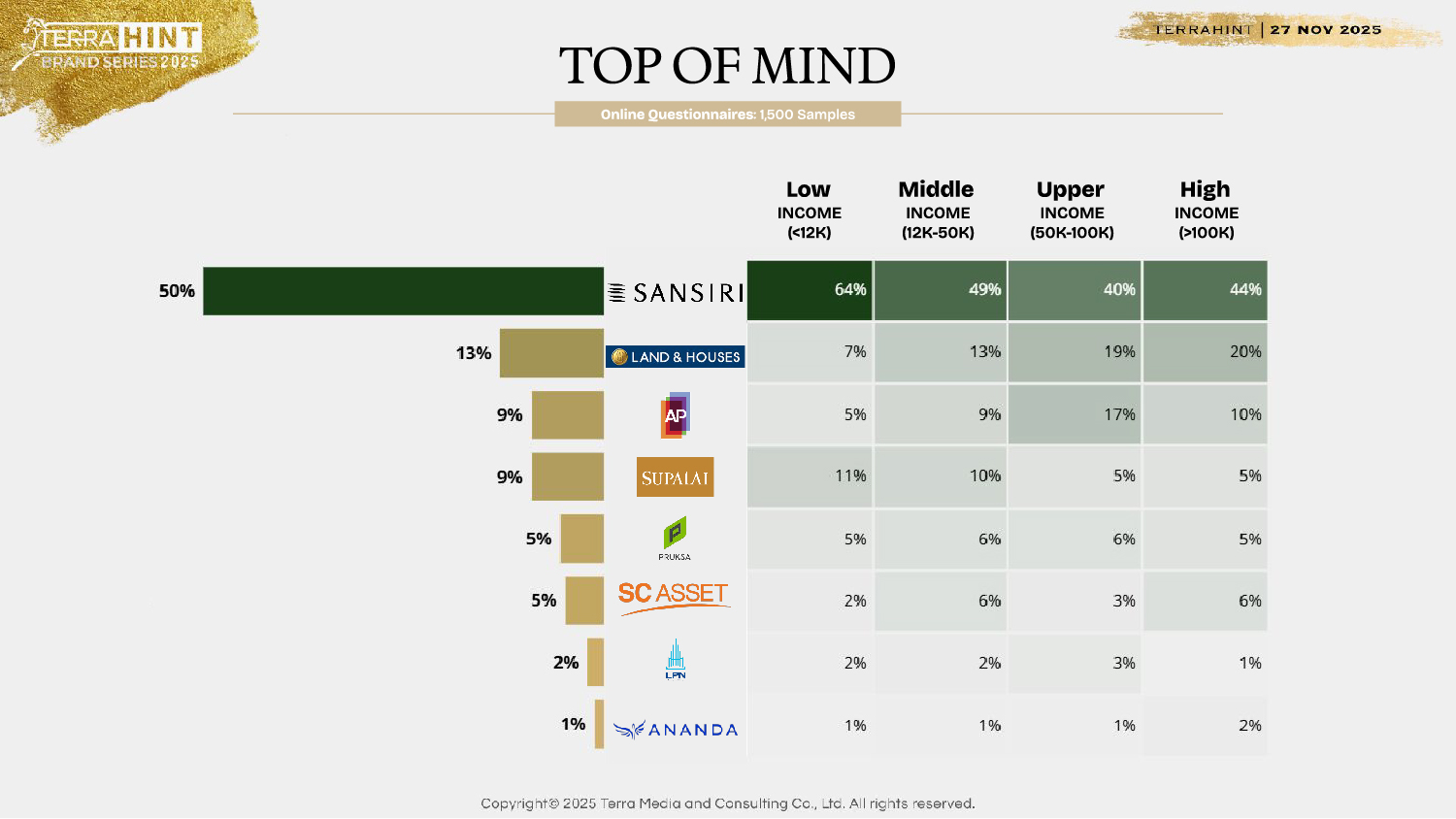 บริษัท แสนสิริ จำกัด (มหาชน) ตอกย้ำความเป็นผู้นำวงการอสังหาริมทรัพย์ไทย ด้วยการคว้า 2 รางวัล สูงสุดแห่งปีจากเวที Terra BKK เวทีสัมมนาด้านอสังหาริมทรัพย์ประจำปี “TerraHint Brand Series 2025 ภายใต้ธีม The Wellness Blueprint #อยู่ดีมีสูตร โดยแสนสิริคว้ารางวัลสูงสุดของเวทีปีนี้ “Hall of Fame” ที่สะท้อนถึงความสำเร็จในการสร้างแบรนด์ที่ทรงพลังในธุรกิจอสังหาริมทรัพย์ หรือ “The Most Powerful Real Estate Brand” ต่อเนื่องมาตลอด 7 ปี รวมทั้งในปีนี้ซึ่งครองแชมป์เป็นปีที่ 8 (2017 – 2025) โดดเด่นด้วยคะแนนยอดเยี่ยมใน 7 มิติสำคัญ ทั้งความหลากหลายของโครงการ คุณภาพที่เป็นที่ยอมรับ สร้างความแตกต่างในตลาด Brand Love และเป็นแบรนด์เป็นที่นิยมในไทย