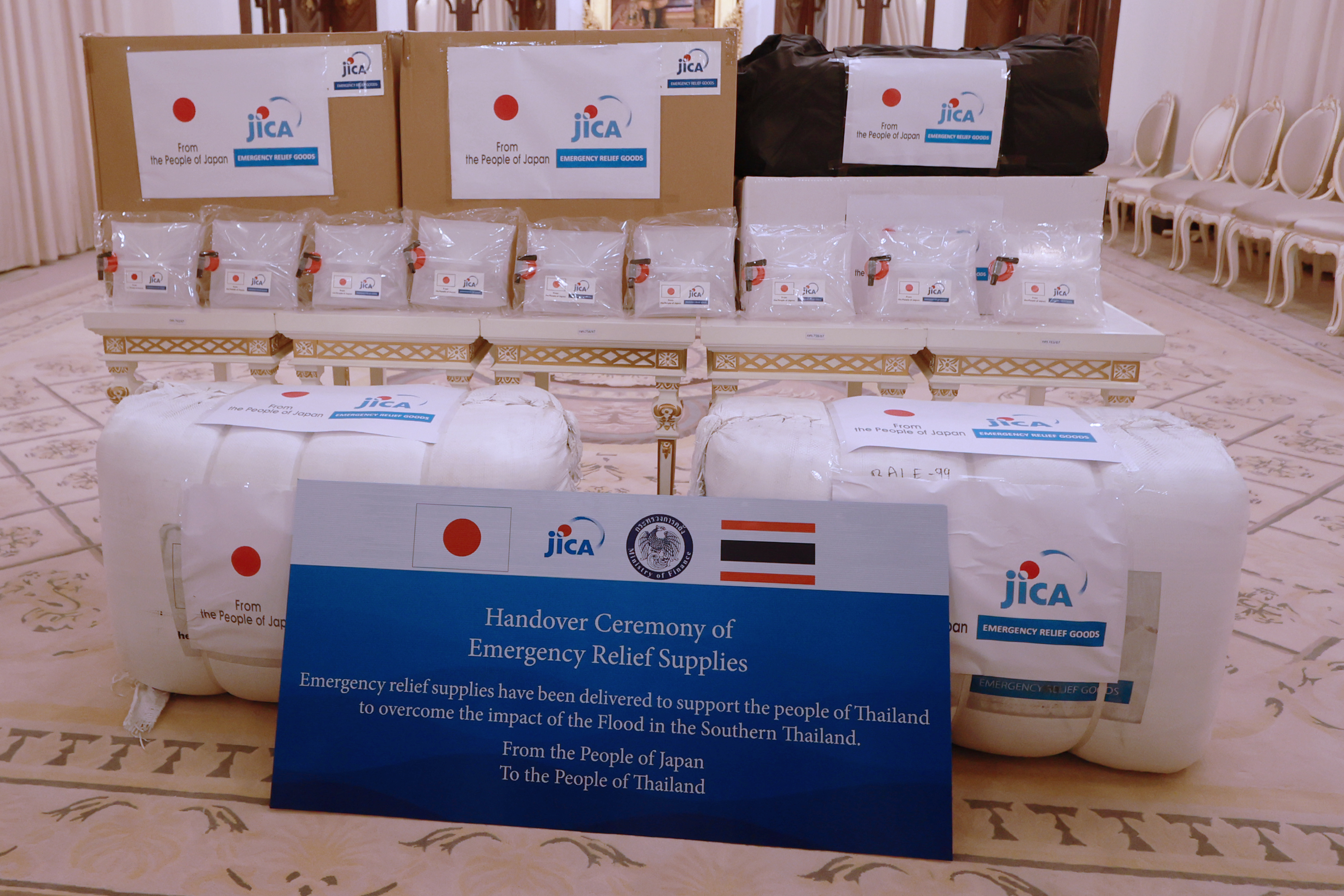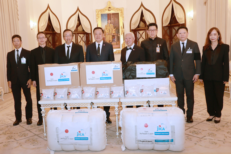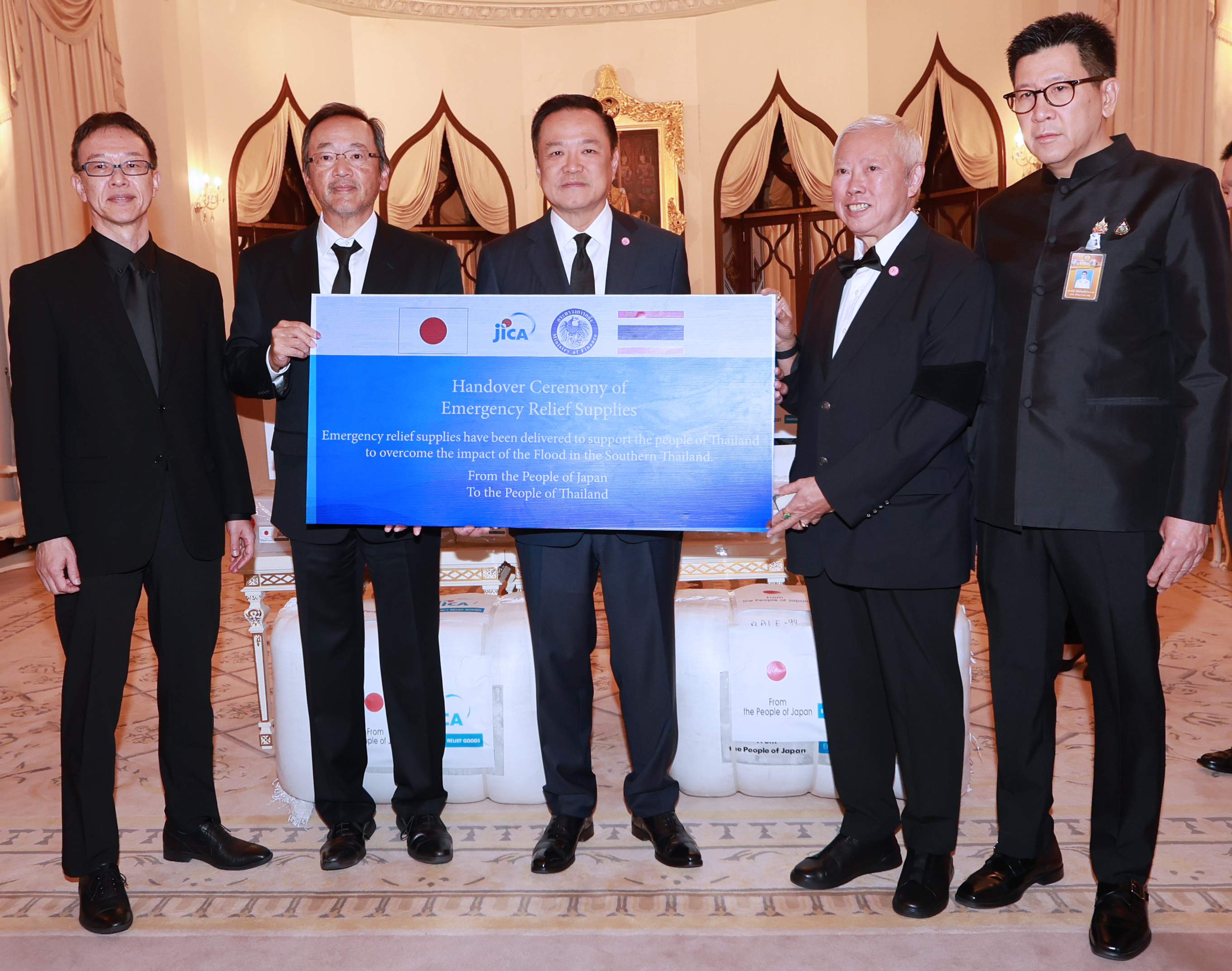 นายอนุทิน ชาญวีรกูล นายกรัฐมนตรีและรัฐมนตรีว่าการกระทรวงมหาดไทย นายบวรศักดิ์ อุวรรณโณ รองนายกรัฐมนตรี และ ดร.เอกนิติ นิติทัณฑ์ประภาศ รองนายกรัฐมนตรีและรัฐมนตรีว่าการ กระทรวงการคลัง ได้เข้าร่วมพิธีรับมอบสิ่งของบรรเทาทุกข์เพื่อช่วยเหลือผู้ประสบอุทกภัยในพื้นที่ภาคใต้จากรัฐบาลญี่ปุ่น จากนายมาซาโตะ โอตากะ เอกอัครราชทูตวิสามัญผู้มีอำนาจเต็มแห่งญี่ปุ่นประจำประเทศไทย และ Mr. Shunsuke Sakudo, Chief Representative of JICA Thailand Office ณ ตึกบัญชาการ 1 ทำเนียบรัฐบาล โดยมีนายลวรณ แสงสนิท ปลัดกระทรวงการคลัง นายอัครุตม์ สนธยานนท์ อธิบดีกรมธนารักษ์ และนางจินดารัตน์ วิริยะทวีกุล ผู้อำนวยการสำนักงานบริหารหนี้สาธารณะ เข้าร่วมด้วย ทั้งนี้ รัฐบาลญี่ปุ่นผ่านองค์การความร่วมมือระหว่างประเทศแห่งญี่ปุ่น (Japan International Cooperation Agency: JICA) ได้มอบสิ่งของบรรเทาทุกข์ ประกอบด้วย เต็นท์ ผ้าห่ม แผ่นรองนอน ถังบรรจุน้ำพับได้ ผ้าใบเอนกประสงค์ และเครื่องกรองน้ำ