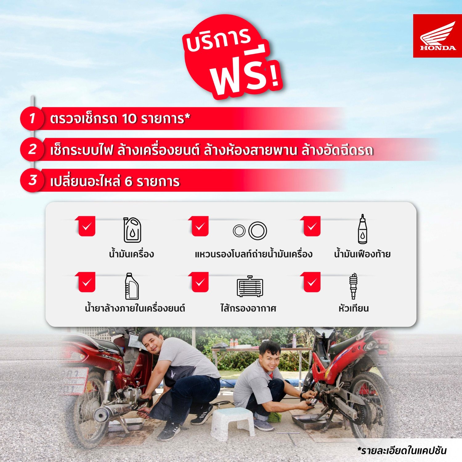 จุดบริการช่วยเหลือครอบคลุมการตรวจเช็กรถจักรยานยนต์ฟรี 10 รายการตามมาตรฐานไทยฮอนด้า 10 รายการ ได้แก่ เครื่องยนต์, ระบบส่งกำลัง, ระบบระบายความร้อน, ระบบเชื้อเพลิง, คลัตช์, ระบบรองรับน้ำหนัก, ระบบเบรก, ระบบไฟฟ้า, ขาตั้งข้าง/ขาตั้งกลาง และล้อ–ยาง พร้อมการตรวจระบบไฟ ล้างห้องเครื่องยนต์ ล้างห้องสายพาน และล้างอัดฉีดตัวรถ เพื่อฟื้นฟูสภาพรถให้กลับมาพร้อมใช้งานได้