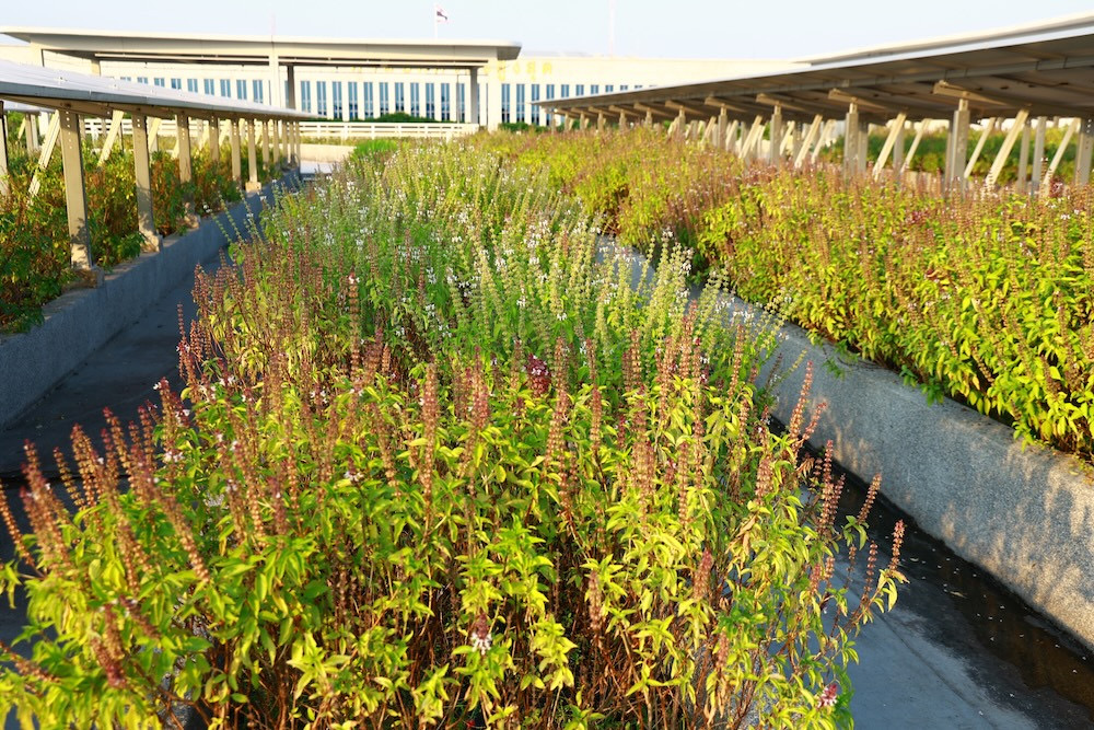 อีกหนึ่งกลยุทธ์สำคัญคือ “From Grey to Green” ฟื้นระบบนิเวศผ่านสถาปัตยกรรม ปรับพื้นที่ดาดฟ้า อาคารจอดรถ A ขนาด 8,000 ตารางเมตร และเชื่อมต่อกับอาคารจอดรถ D จัตุรัสลอยฟ้า A-D หน้าบ้านใหม่ศูนย์ราชการเฉลิมพระเกียรติฯ ให้เป็นลานกิจกรรมกลางแจ้ง อาคารจอดรถเดิมถูกพัฒนาให้กลายเป็น ฟองน้ำยักษ์ (Sponge Parking) ที่กักเก็บและนำน้ำฝนกลับมาใช้ซ้ำแบบ Zero Runoff Discharge นอกจากนี้ยังพัฒนาพื้นที่บ่อน้ำเดิม 14 ไร่ให้กลายเป็น B-Park อุทยานลอยน้ำอาคาร B (B-Park Urban Floating Oasis) ด้วยพันธุ์ไม้พื้นถิ่น ช่วยลดอุณหภูมิรอบพื้นที่ได้สูงถึง 9°C แนวคิดนี้สะท้อนการออกแบบเชิงระบบนิเวศที่เน้น “การอยู่ร่วม” มากกว่าการแยกส่วน