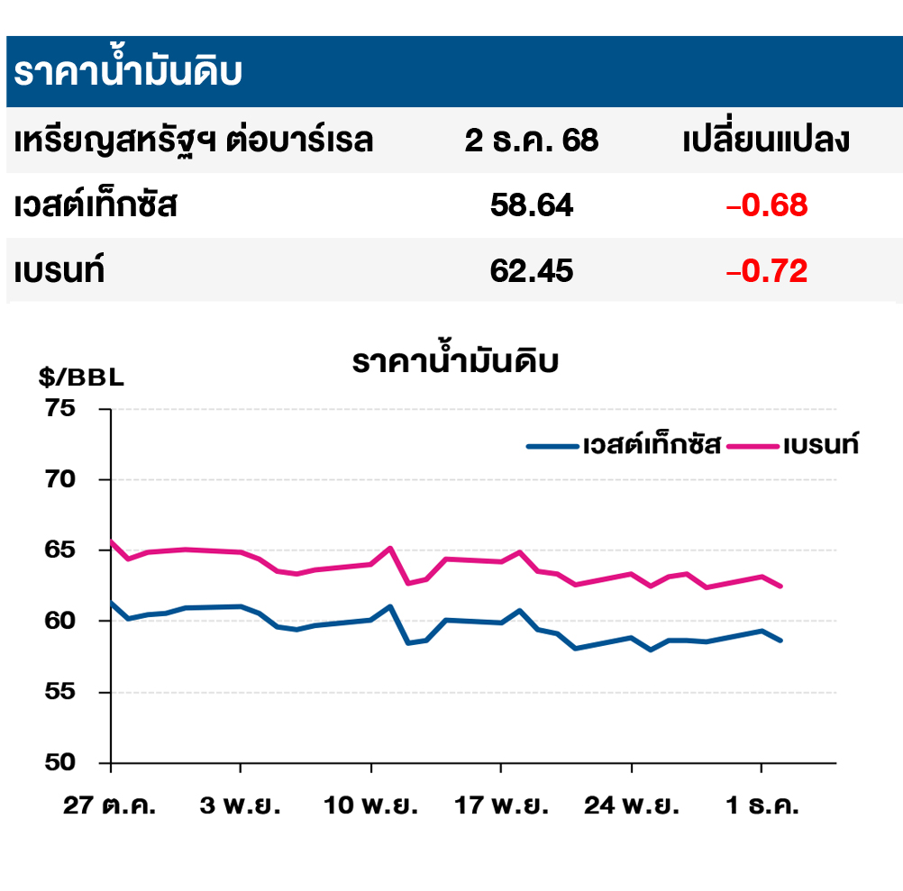 (-) ตลาดยังคงกังวลอุปทานล้นตลาด หลังกลุ่มโอเปกพลัสตัดสินใจคงระดับการผลิตน้ำมันในไตรมาสแรกปี 2569 เพื่อรักษาเสถียรภาพของตลาด ขณะที่ข้อมูลจากสถาบันปิโตรเลียมด้านพลังงานสหรัฐฯ (API) เผยปริมาณน้ำมันดิบคงคลังสหรัฐฯ ณ สิ้นสุดสัปดาห์วันที่ 28 พ.ย. 68 ปรับตัวเพิ่มขึ้น 2.48 ล้านบาร์เรล สะท้อนแรงกดดันจากอุปทานส่วนเกินในตลาดโลก