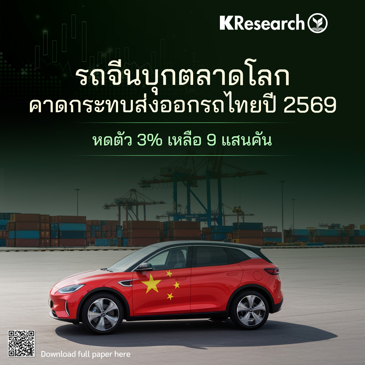 · ปี 2569 คาดไทยยังคงส่งออกรถยนต์ลดลงต่อที่ 3% (YoY) เหลือราว 9 แสนคัน จากปีนี้ที่คาดทำได้ 9.3 แสนคัน ดังนั้นเพื่อก้าวข้ามการหดตัวต่อเนื่องในอนาคต การเร่งพัฒนาขึ้นเป็นฐานผลิตหลักของรถยนต์นั่งและปิกอัพ xEV ที่ตลาดกำลังต้องการเป็นสิ่งจำเป็น ขณะเดียวกันการพัฒนาลดต้นทุนการผลิตปิกอัพ ICE ให้พอแข่งขันกับจีนได้ รวมถึงการเร่งเพิ่มโอกาสส่งออกไปตลาดใหม่ก็เป็นสิ่งที่ควรทำควบคู่กันไป