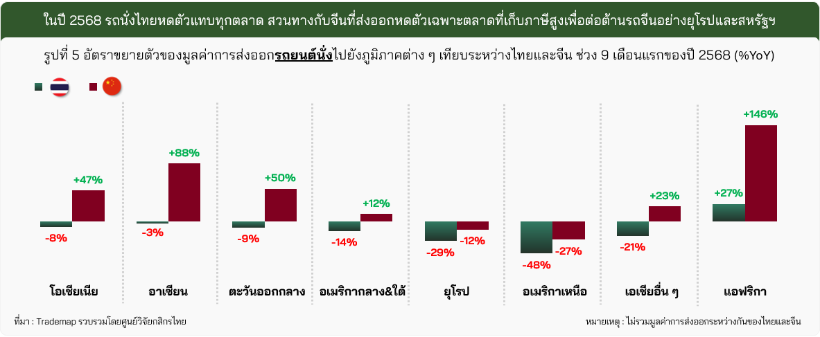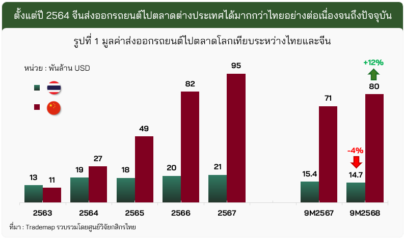· การส่งออกรถยนต์ไทยกำลังถูกจีนเข้าแย่งตลาดมากขึ้นเรื่อย ๆ โดยในกลุ่มรถยนต์นั่งพบการแข่งขันที่เพิ่มขึ้นชัดเจนจากกลุ่ม xEV จากจีน ส่วนกลุ่มปิกอัพแม้ยังส่งออกได้ดี แต่ตลาดหลักอย่างออสเตรเลียเริ่มมีปัญหา โดยจีนได้ขยับขึ้นเป็นหนึ่งคู่แข่งสำคัญ ซึ่งลักษณะเดียวกันนี้เกิดขึ้นกับในอีกหลายตลาด