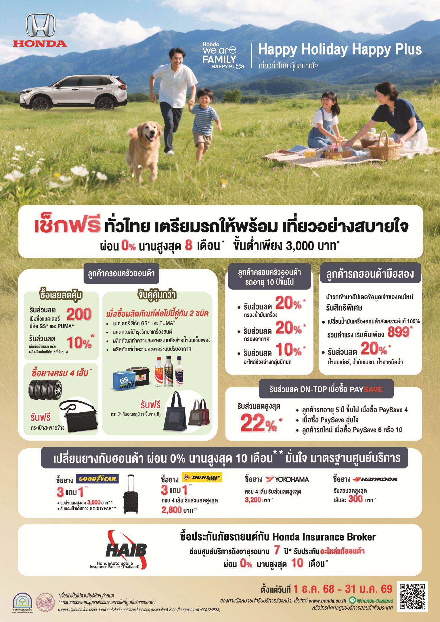 บริษัท ฮอนด้า ออโตโมบิล (ประเทศไทย) จำกัด เสิร์ฟความอุ่นใจส่งท้ายปีกับแคมเปญสุดพิเศษ “Happy Holiday Happy Plus! เที่ยวทั่วไทย คุ้มสบายใจ” พร้อมดูแลรถยนต์คู่ใจแบบครบวงจร สำหรับครอบครัวฮอนด้าบริการตรวจสภาพรถยนต์ฟรี* พร้อมผ่อนสบายไร้กังวล ! สำหรับงานบริการทุกประเภท ผ่อนชำระ 0% นานสูงสุด 8 เดือน* อัปเกรดความคุ้มค่า รับส่วนลดผลิตภัณฑ์ที่กำหนดมูลค่าสูงสุด 20%* สำหรับครอบครัวฮอนด้าทั้งลูกค้ารถใหม่ รถเก่า และรถมือสอง พร้อมโปรแกรมผ่อนชำระยางรถยนต์ 0% นานสูงสุด 10 เดือน* สิทธิพิเศษสุดคุ้มที่ครบ จบ ทุกความต้องการ ! เพียงนัดหมายและนำรถยนต์เข้ารับบริการที่ศูนย์บริการรถยนต์ฮอนด้าทั่วประเทศ ตั้งแต่วันที่ 1 ธันวาคม 2568 ถึง 31 มกราคม 2569