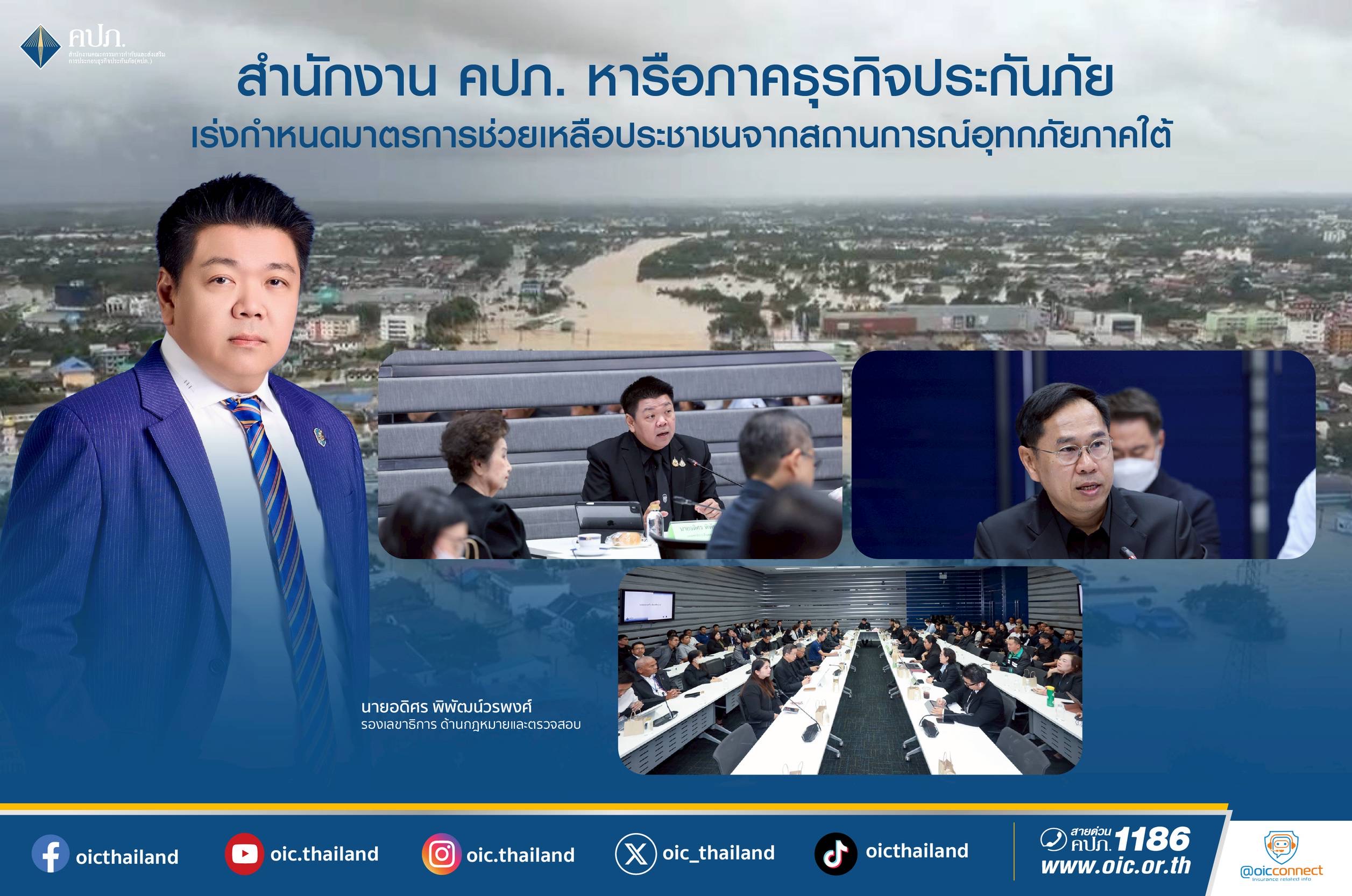 เมื่อวันที่ 3 ธันวาคม 2568 นายชูฉัตร ประมูลผล เลขาธิการคณะกรรมการกำกับและส่งเสริมการประกอบธุรกิจประกันภัย (เลขาธิการ คปภ.) มอบหมายให้นายอดิศร พิพัฒน์วรพงศ์ รองเลขาธิการ ด้านกฎหมายและตรวจสอบ เป็นประธานการประชุม โดยมีนายคณานุสรณ์ เที่ยงตระกูล ผู้ช่วยเลขาธิการ สายคุ้มครองสิทธิประโยชน์ พร้อมผู้แทนจากภาคธุรกิจประกันภัย และหน่วยงานที่เกี่ยวข้องเข้าร่วมประชุมเพื่อ “กำหนดมาตรการช่วยเหลือประชาชนจากสถานการณ์อุทกภัยภาคใต้” ณ ห้องประชุมสถาบันวิทยาการประกันภัยระดับสูง ชั้น 2 สำนักงาน คปภ. ถนนรัชดาภิเษก