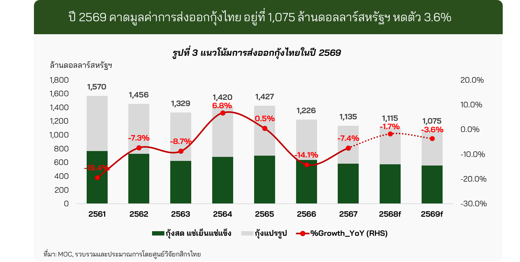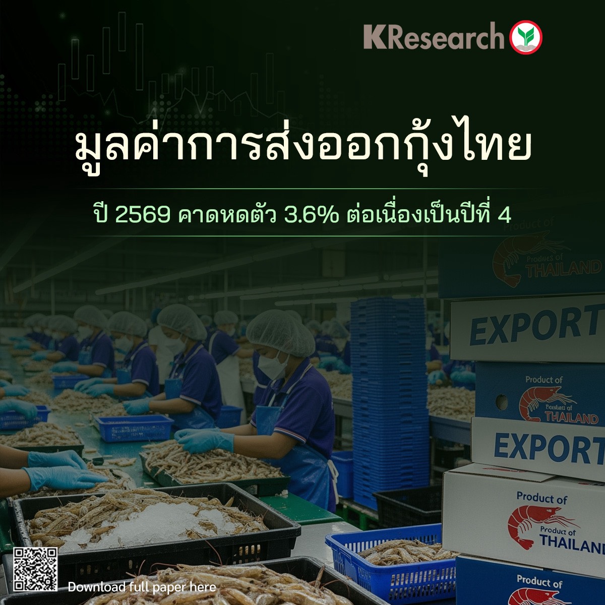ปี 2569 คาดมูลค่าการส่งออกกุ้งของไทยยังหดตัวต่อเนื่องเป็นปีที่ 4 จากความต้องการในตลาดโลกที่อ่อนแอ และเผชิญการแข่งขันรุนแรง