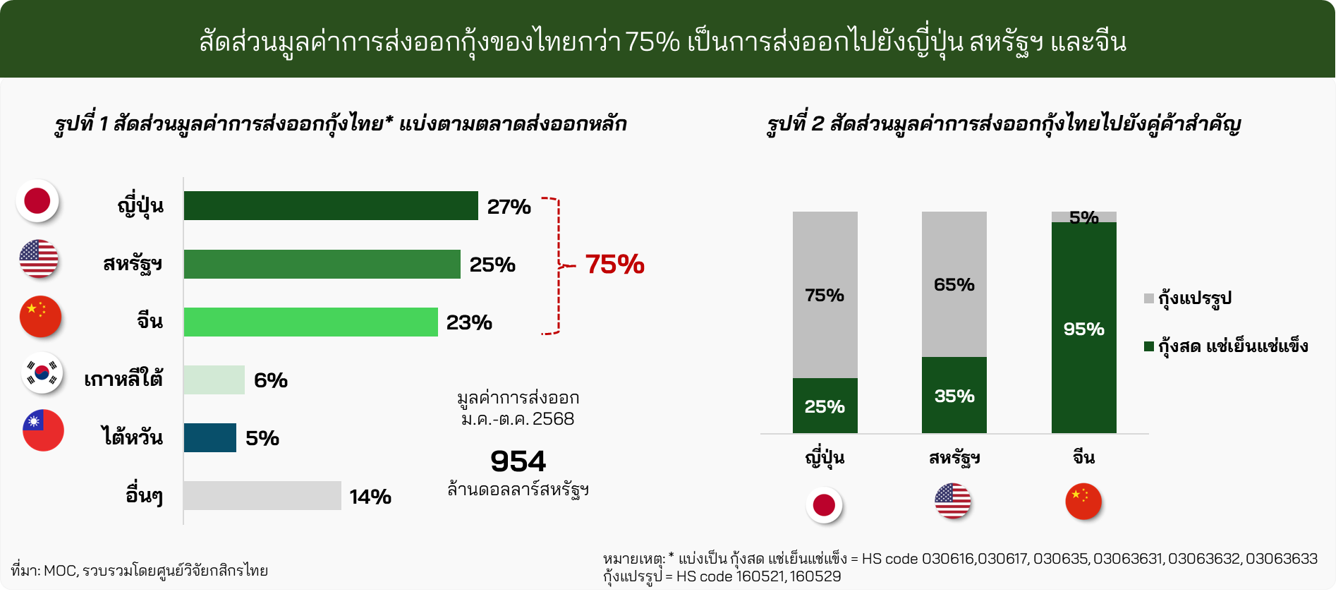 สินค้าส่งออกสำคัญของไทย ได้แก่ กุ้งสด แช่เย็นแช่แข็ง และกุ้งแปรรูป (รวมกุ้งกระป๋อง) ซึ่งมีตลาดส่งออกสำคัญ ได้แก่ ญี่ปุ่น สหรัฐฯ และจีน ที่มีส่วนแบ่งในมูลค่าการส่งออกรวมกันกว่า 75% ของมูลค่าการส่งออกกุ้งของไทยทั้งหมด (รูปที่ 1) ทั้งนี้ สัดส่วนการส่งออกจะแตกต่างกันในแต่ละประเทศ สำหรับตลาดญี่ปุ่น และสหรัฐฯ ไทยเน้นส่งออกกุ้งแปรรูป ขณะที่ ตลาดจีน ไทยส่งออกกุ้งสด แช่เย็นแช่แข็งเป็นหลัก (รูปที่ 2)