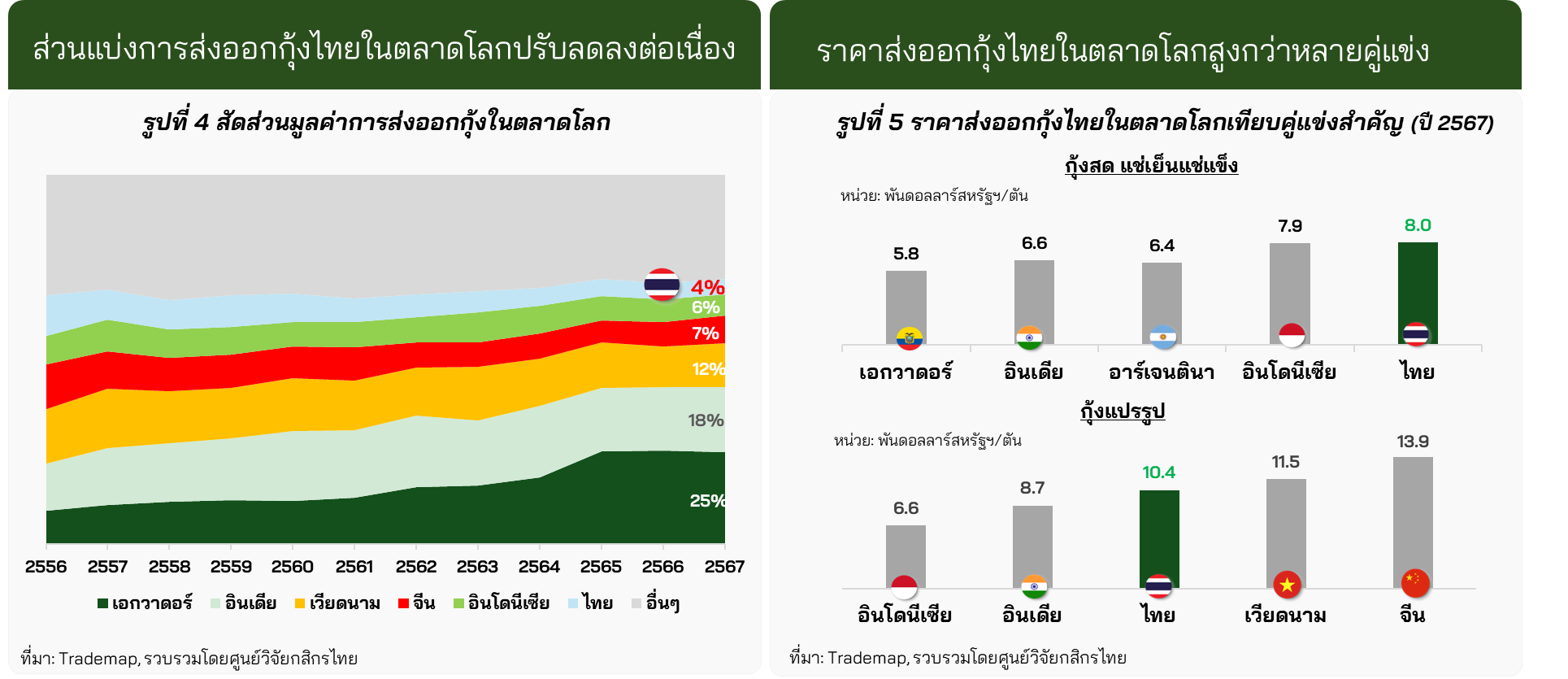 1) ต้นทุนการผลิตกุ้งของไทยสูง ส่งผลให้ราคาส่งออกกุ้งเฉลี่ยของไทยในตลาดโลกแพงกว่าคู่แข่ง (รูปที่ 5) โดยเฉพาะอินเดีย และเอกวาดอร์ ซึ่งมีความได้เปรียบไทยทั้งเรื่อง 1) ปริมาณผลผลิตที่มีมากกว่าไทย 2-5 เท่า จากการพัฒนาเทคโนโลยีเพื่อเพิ่มผลผลิต ประกอบกับลักษณะการเลี้ยงที่เป็นฟาร์มขนาดใหญ่ การเลี้ยงไม่แออัด ทำให้สามารถควบคุมโรคระบาดได้ดีกว่า 2) ต้นทุนการเลี้ยงถูกกว่า เช่น ค่าแรง ค่าไฟฟ้า และค่าอาหารกุ้งอย่างกากถั่วเหลืองที่ไทยต้องพึ่งพาการนำเข้าในสัดส่วนสูง รวมถึงไทยยังมีต้นทุนแฝงจากต้องปฏิบัติตามมาตรฐานการเลี้ยง/ควบคุมโรคที่เข้มงวดกว่า