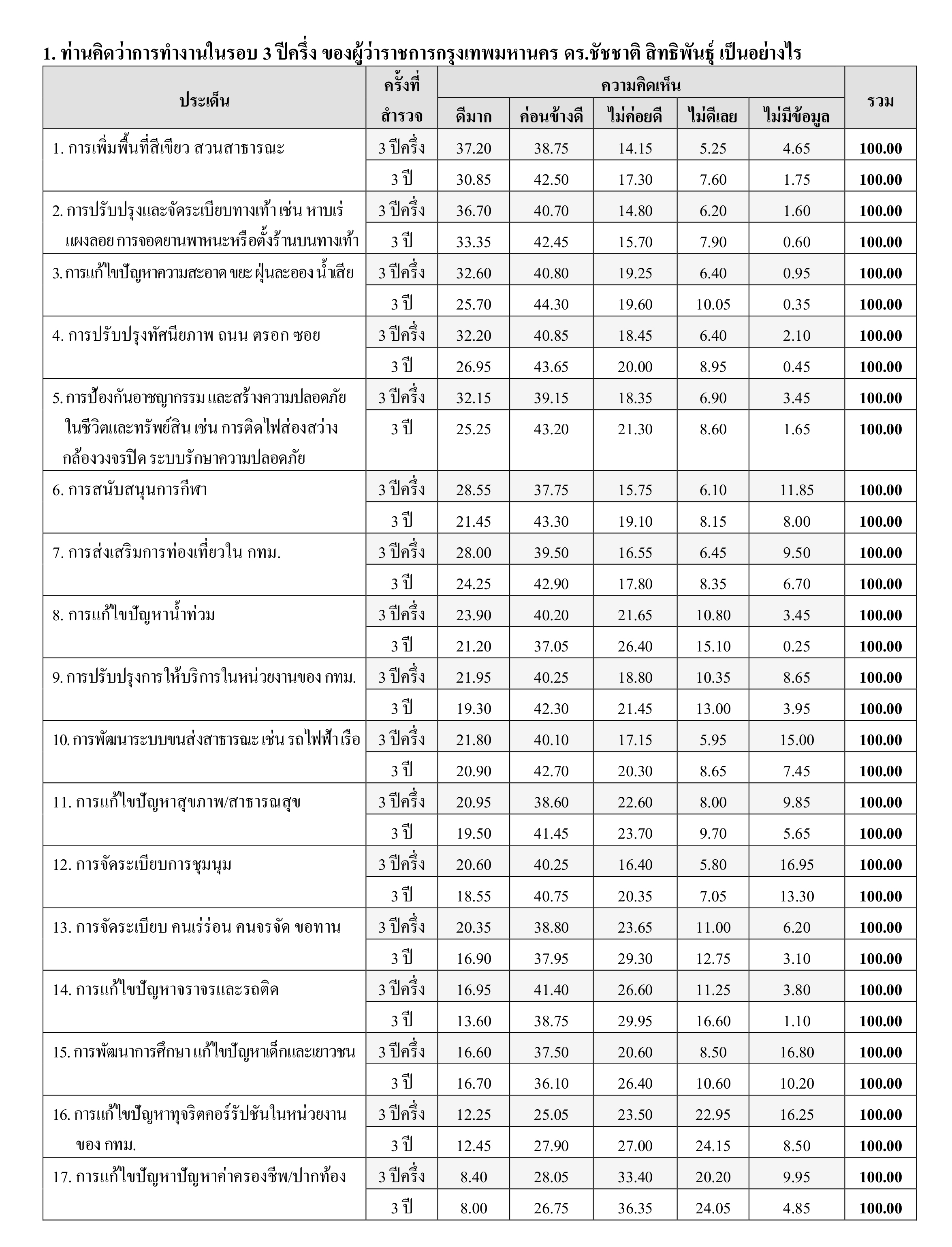 จากการสำรวจเมื่อถามถึงความคิดเห็นของคนกรุงเทพมหานครต่อการทำงานในรอบ 3 ปีครึ่ง ของผู้ว่าราชการกรุงเทพมหานคร ดร.ชัชชาติ สิทธิพันธุ์ ในประเด็นต่าง ๆ ดังนี้