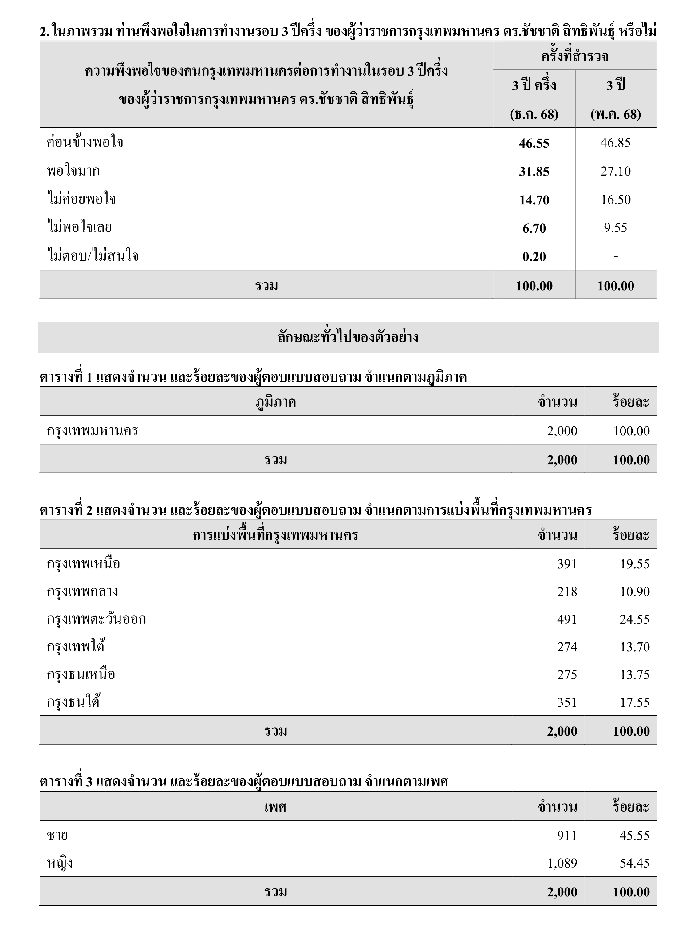 ท้ายที่สุดเมื่อถามถึงความพึงพอใจของคนกรุงเทพมหานครต่อการทำงานในรอบ 3 ปีครึ่ง ของผู้ว่าราชการกรุงเทพมหานคร ดร.ชัชชาติ สิทธิพันธุ์ พบว่า ตัวอย่าง ร้อยละ 46.55 ระบุว่า ค่อนข้างพอใจ รองลงมา ร้อยละ 31.85 ระบุว่า พอใจมาก ร้อยละ 14.70 ระบุว่า ไม่ค่อยพอใจ ร้อยละ 6.70 ระบุว่า ไม่พอใจเลย และร้อยละ 0.20 ระบุว่า ไม่ตอบ/ไม่สนใจ