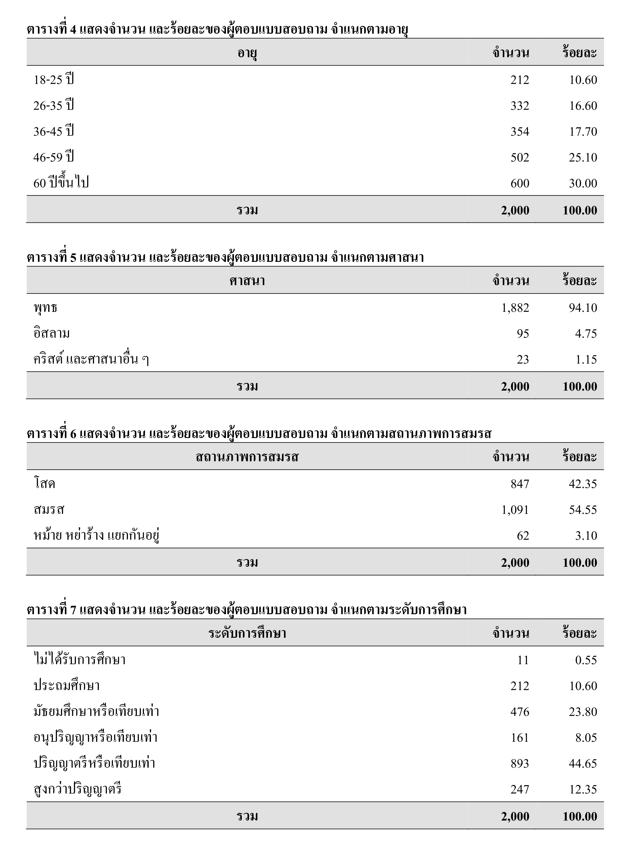 ตัวอย่าง ร้อยละ 10.60 อายุ 18-25 ปี ร้อยละ 16.60 อายุ 26-35 ปี ร้อยละ 17.70 อายุ 36-45 ปี ร้อยละ 25.10 อายุ 46-59 ปี และร้อยละ 30.00 อายุ 60 ปีขึ้นไป โดยตัวอย่าง ร้อยละ 94.10 นับถือศาสนาพุทธ ร้อยละ 4.75 นับถือศาสนาอิสลาม และร้อยละ 1.15 นับถือศาสนาคริสต์ และศาสนาอื่น ๆ