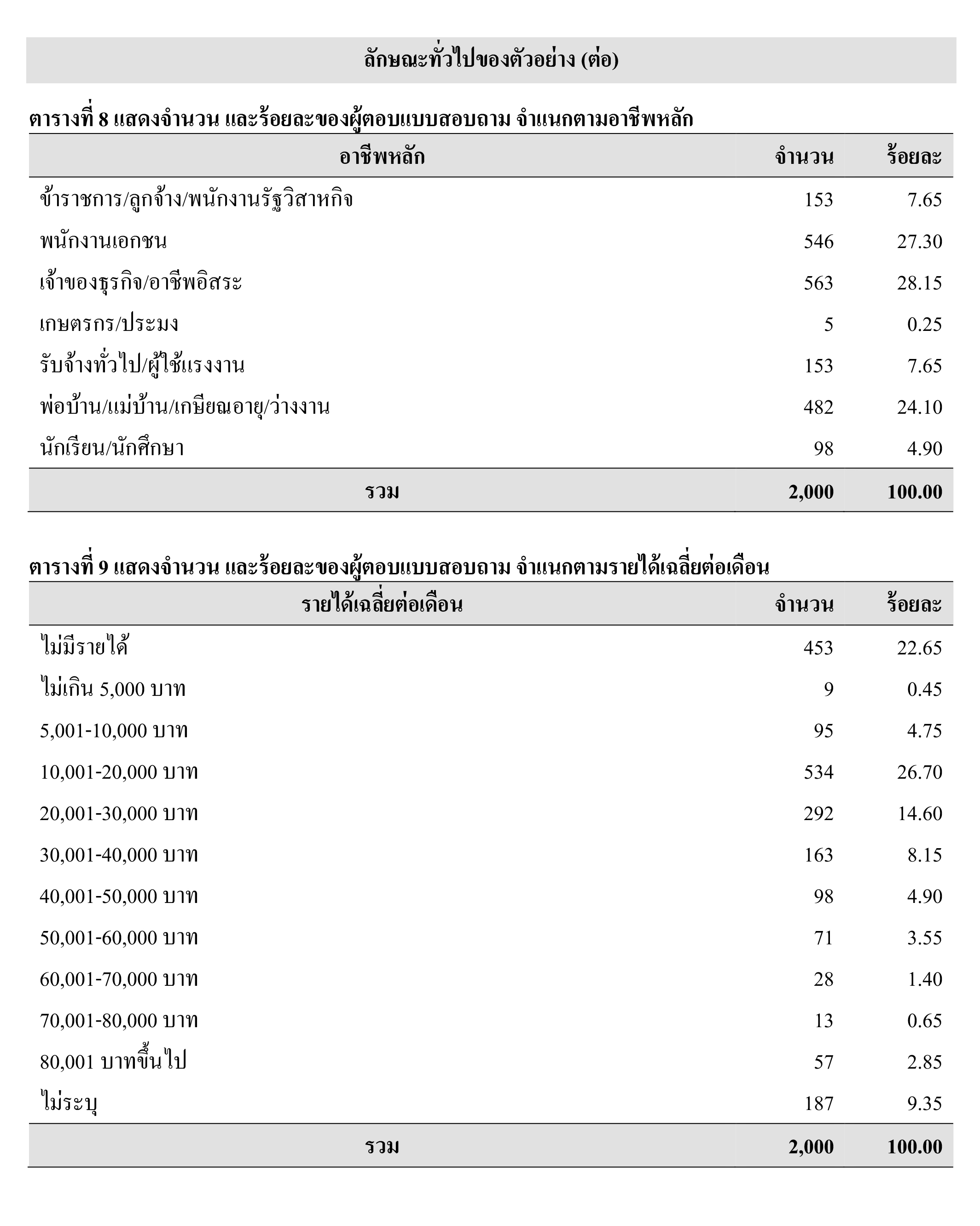 ตัวอย่าง ร้อยละ 7.65 ประกอบอาชีพข้าราชการ/ลูกจ้าง/พนักงานรัฐวิสาหกิจ ร้อยละ 27.30 ประกอบอาชีพพนักงานเอกชน ร้อยละ 28.15 ประกอบอาชีพเจ้าของธุรกิจ/อาชีพอิสระ ร้อยละ 0.25 ประกอบอาชีพเกษตรกร/ประมง ร้อยละ 7.65 ประกอบอาชีพรับจ้างทั่วไป/ผู้ใช้แรงงาน ร้อยละ 24.10 เป็นพ่อบ้าน/แม่บ้าน/เกษียณอายุ/ว่างงาน และร้อยละ 4.90 เป็นนักเรียน/นักศึกษา
