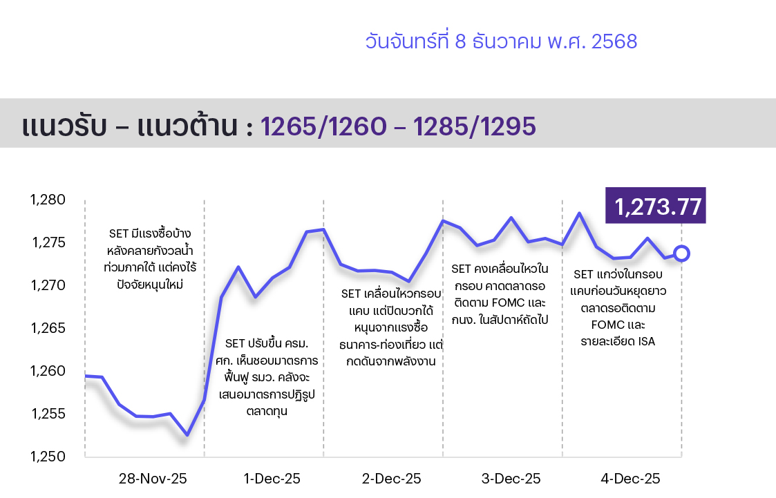 คาดตลาดแกว่งไซด์เวย์/รอเบรค ติดตามมาตรการส่งเสริมการออม (ISA) จะมีรายละเอียดที่น่าสนใจมากพอและดึงดูดเม็ดเงินไหลเข้าตลาดเพียงใด รวมถึงสถานการณ์ชายแดนไทย-กัมพูชาที่ร้อนแรงอีกครั้ง ส่วนปัจจัยต่างประเทศ Core PCE สหรัฐที่เริ่มชะลอตัวหนุนให้เฟดลดดอกเบี้ยง่ายขึ้น แต่สัญญาณลดดอกเบี้ยปีหน้ายังเป็นสิ่งที่ตลาดสนใจ ทางเทคนิค ตลาดยังไม่ยืนเหนือ 1275-1278 ต้องยืนเหนือได้จึงจะแกว่งตัวขึ้นรอบใหม่ ยืนไม่ได้ยังไซด์เวย์ แนวรับ 1265/1260 แนวต้าน 1285/1295